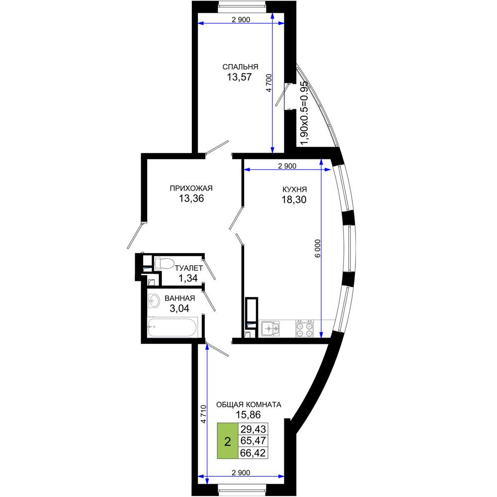 - Общая площадь 66.42 м²