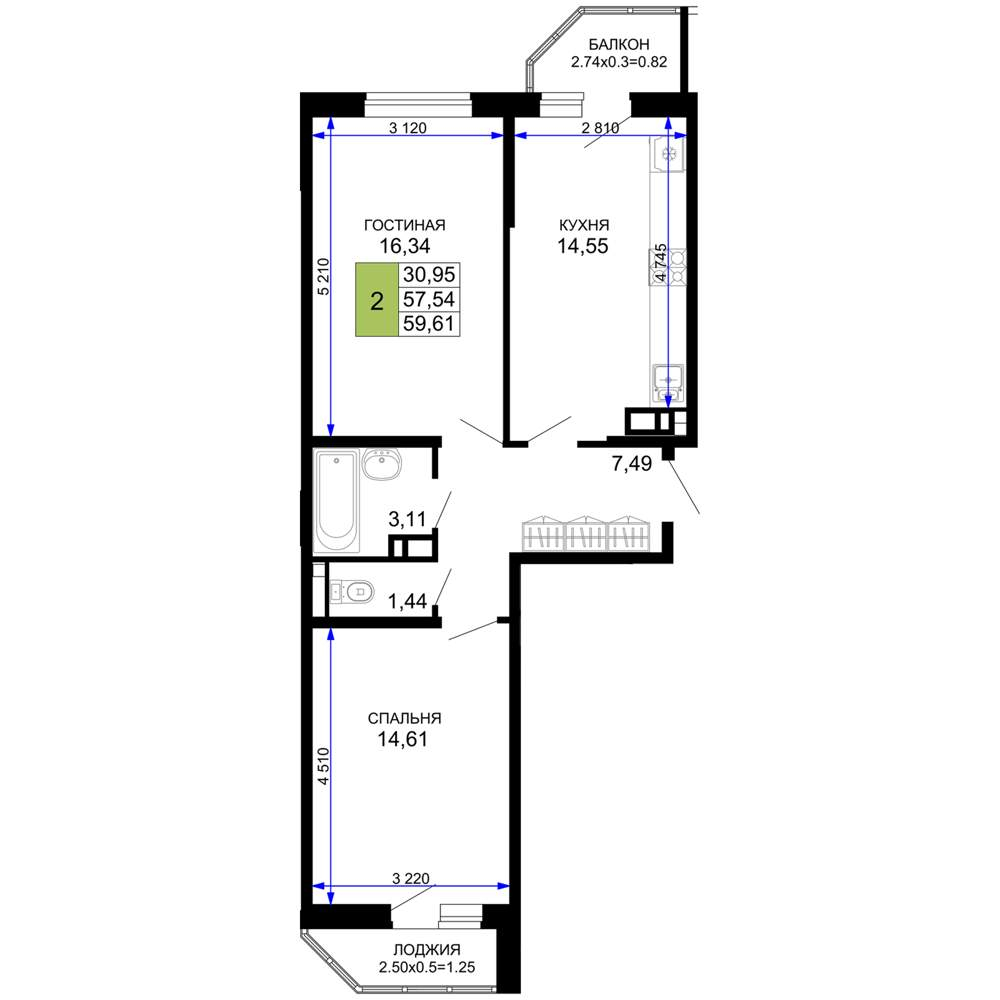 - Общая площадь 59.61 м²