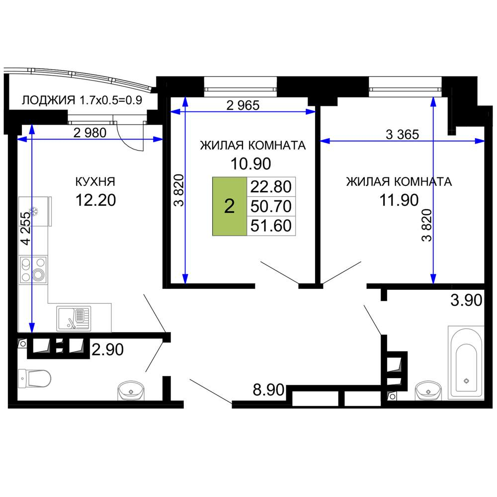- Жилая площадь 22.8 м²