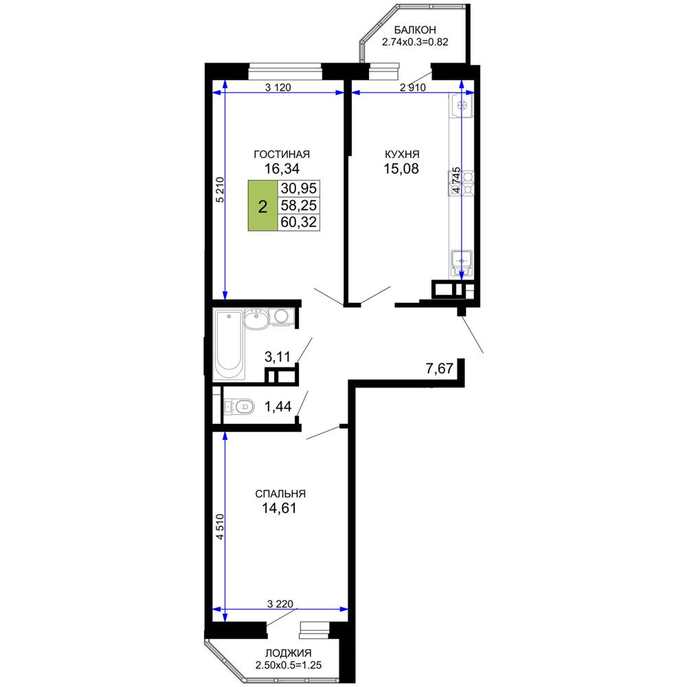 Квартира 2-комн., 60 м2, 12/12 этаж,