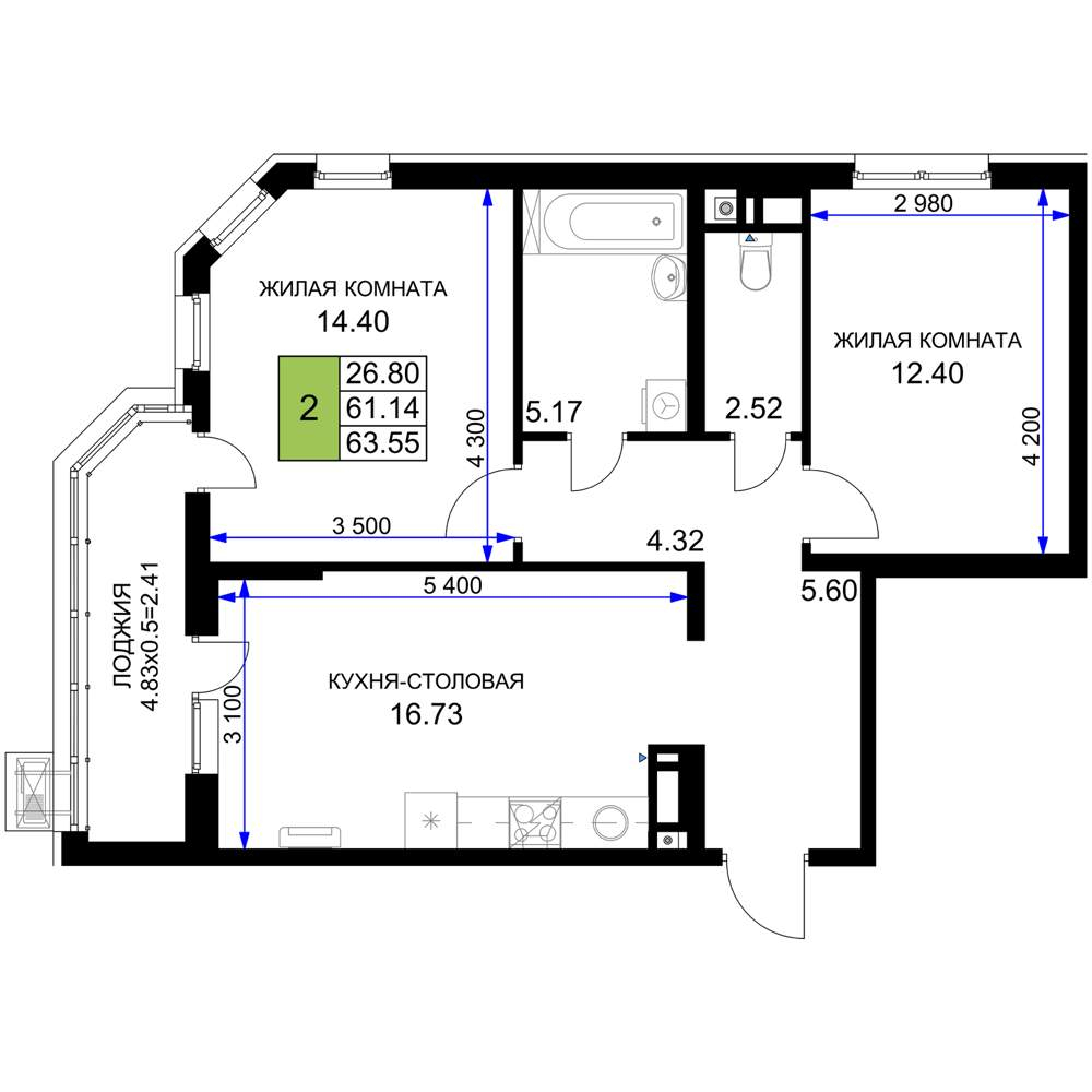 Квартира 2-комн., 64 м2, 14/18 этаж,