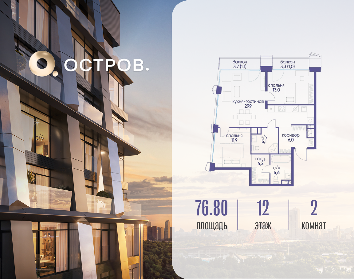 Продаётся двухкомнатная квартира от застройщика: общая площадь 76.82 м², жилая 24.90 м², кухня 29.90 м², 12, жилой квартал «Остров 12», корпус 3 (12.1 квартал) (секция 1). срок сдачи: 4-кв. 2025. , 2 санузла: 2 совмещенных. В жилой зоне 2 больших окна на одну сторону, хорошая инсоляция. Позвоните сейчас и забронируйте квартиру! Купите квартиру для курортной жизни в Москве в квартале ОСТРОВ.12.1. Это единственный на ОСТРОВЕ квартал бизнес-класса, расположенный на первой линии у реки - здесь царит атмосфера ежедневного отпуска. Дома созданы в узнаваемом футуристичном стиле и выглядят как произведения современного искусства. Для жителей предусмотрены фитнес-рум и детский клуб, гостиная и кинотеатр, переговорные и репетиторские комнаты. На крышах устроены видовые общественные пространства с зонами для йоги, коворкингами, лаунжами. Двор-парк располагает всем необходимым для отдыха и общения всех возрастов. ОСТРОВ.12.1 - часть жилого комплекса на западе Москвы, в 15 минутах езды от центра. Это настоящий заповедник посреди большого города, в окружении реки и 650 га заповедников. Здесь все необходимое находится по соседству: от детского сада до супермаркета, от фитнес-зала до серфинг-центра. На территории созданы все условия для отдыха и общения: клубная инфраструктура в домах и дворы-парки, набережные и променады, маршруты для спортсменов, детей и возрастных жителей. В нескольких минутах ходьбы расположена станция метро "Мнёвники" БКЛ. На автомобиле - 10 минут до Москва-Сити и 15 минут до Садового кольца.