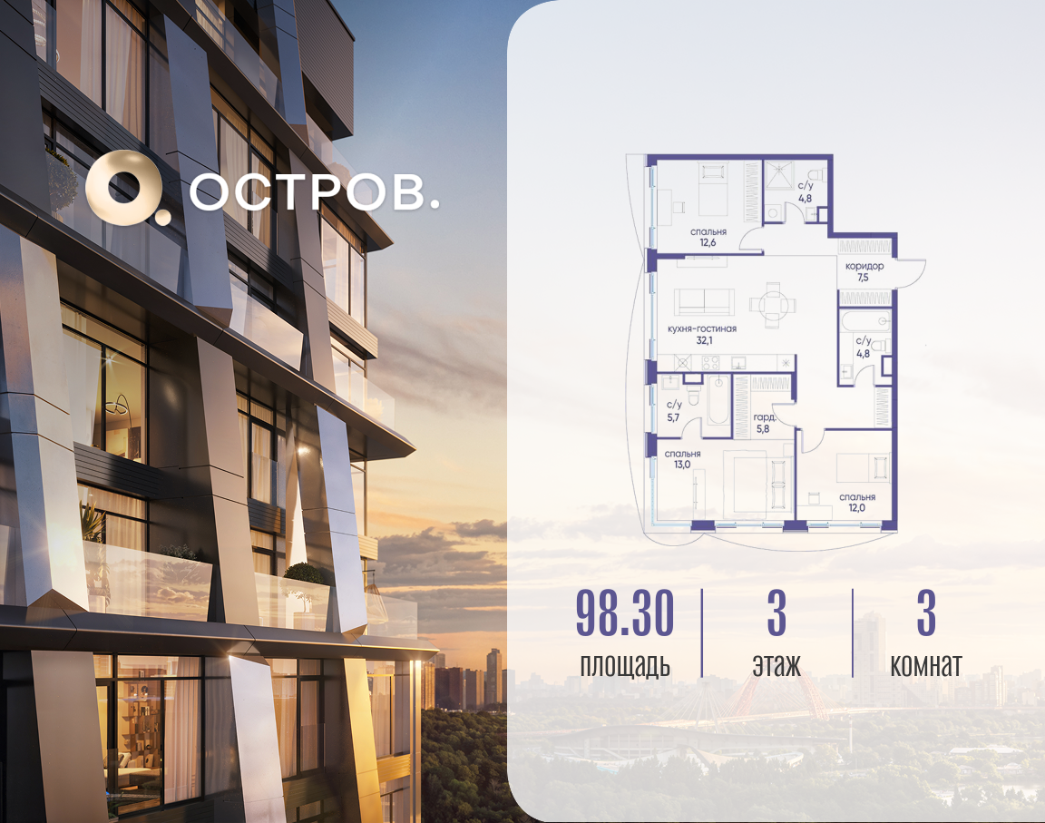 Продаётся 3-комн. квартира от застройщика: общая площадь 98.32 м², жилая 37.60 м², кухня 32.10 м², 3-й этаж, жилой квартал «Остров 12», корпус 4 (секция 1). Срок сдачи: 1 квартал 2029 года. 3 совмещенных санузла. В жилой зоне 2 больших окна на одну сторону, хорошая инсоляция. Позвоните сейчас и забронируйте квартиру! ОСТРОВ от Донстрой — жилой комплекс на западе Москвы, в Мневниковской пойме. Уникальное преимущество комплекса — в том, что он обособлен от города рекой и природным парком (650 га). Благодаря природному окружению эта территория имеет лучший экологический рейтинг в столице. Кварталы ОСТРОВА объединены ландшафтным дизайном в единое пространство — с набережными и Центральным бульваром. На ОСТРОВЕ любые объекты, необходимые для полноценной жизни и отдыха, находятся на расстоянии 15-минутной прогулки. Торговый центр и супермаркеты, кафе и рестораны, фитнес, салоны красоты, школы и детские сады. А также крупнейший в Москве спортивный кластер.
