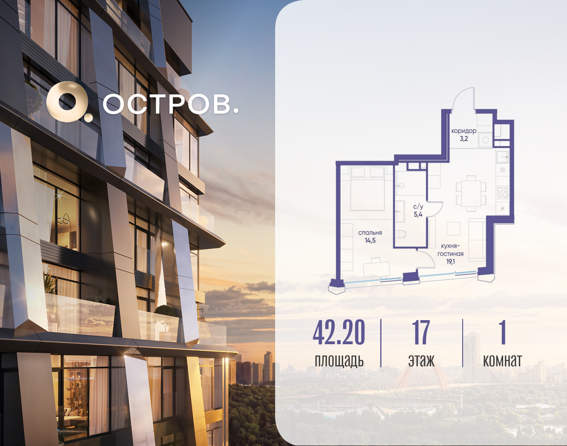 Продаётся 1-комн. квартира от застройщика: общая площадь 42.22 м², жилая 14.50 м², кухня 19.10 м², 17-й этаж, жилой квартал «Остров 12», корпус 2 (секция 1). Срок сдачи: 1 квартал 2029 года. 1 совмещенный санузел. В жилой зоне 2 больших окна на одну сторону, хорошая инсоляция. Позвоните сейчас и забронируйте квартиру! ОСТРОВ от Донстрой — жилой комплекс на западе Москвы, в Мневниковской пойме. Уникальное преимущество комплекса — в том, что он обособлен от города рекой и природным парком (650 га). Благодаря природному окружению эта территория имеет лучший экологический рейтинг в столице. Кварталы ОСТРОВА объединены ландшафтным дизайном в единое пространство — с набережными и Центральным бульваром. На ОСТРОВЕ любые объекты, необходимые для полноценной жизни и отдыха, находятся на расстоянии 15-минутной прогулки. Торговый центр и супермаркеты, кафе и рестораны, фитнес, салоны красоты, школы и детские сады. А также крупнейший в Москве спортивный кластер.