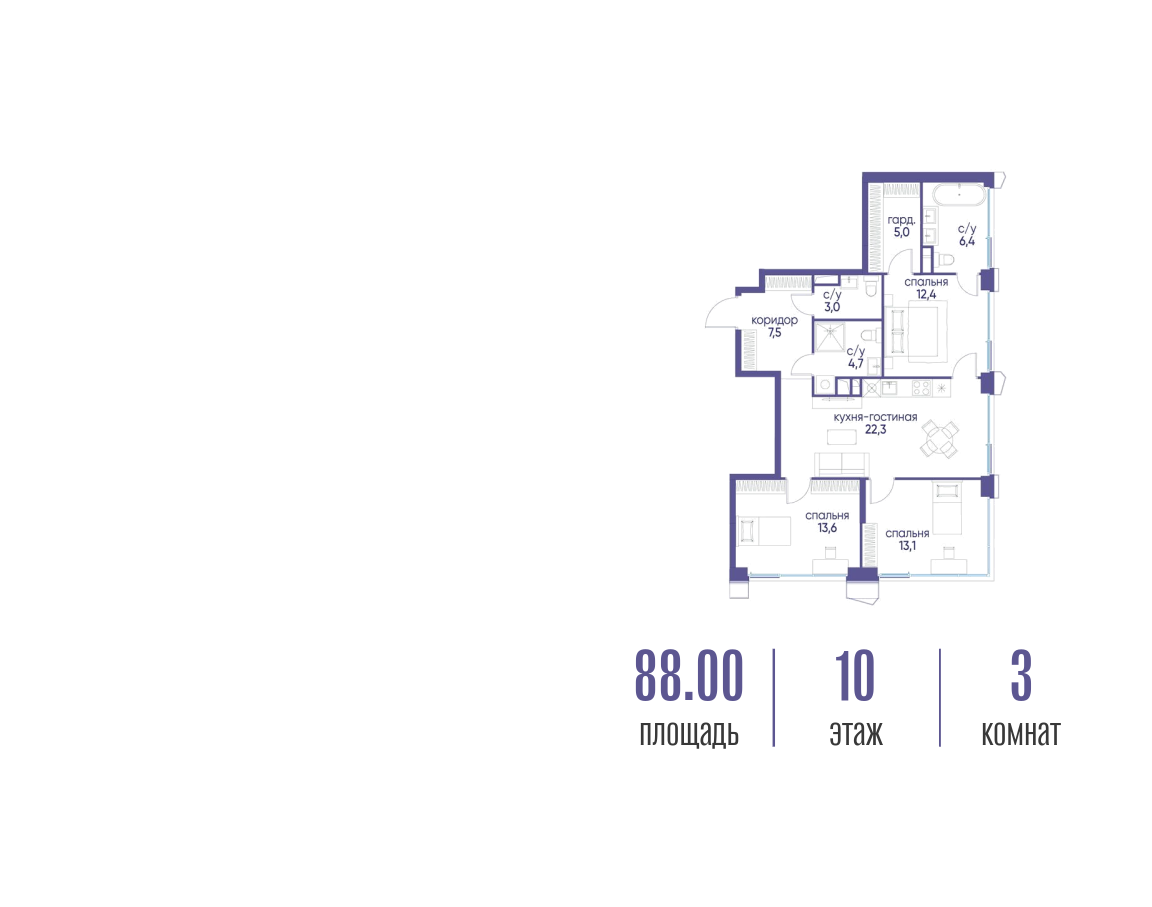 Квартира 3-комн., 88 м2, 10/22 этаж,