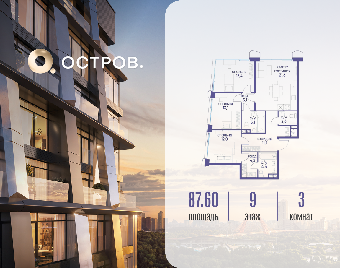 Продаётся трехкомнатная квартира от застройщика: общая площадь 87.62 м², жилая 38.50 м², кухня 21.60 м², 9, жилой квартал «Остров 12», корпус 3 (12.1 квартал) (секция 1). срок сдачи: 4-кв. 2025. , 3 санузла: 1 раздельный и 2 совмещенных. В жилой зоне 2 больших окна на одну сторону, хорошая инсоляция. Позвоните сейчас и забронируйте квартиру! Купите квартиру для курортной жизни в Москве в квартале ОСТРОВ.12.1. Это единственный на ОСТРОВЕ квартал бизнес-класса, расположенный на первой линии у реки - здесь царит атмосфера ежедневного отпуска. Дома созданы в узнаваемом футуристичном стиле и выглядят как произведения современного искусства. Для жителей предусмотрены фитнес-рум и детский клуб, гостиная и кинотеатр, переговорные и репетиторские комнаты. На крышах устроены видовые общественные пространства с зонами для йоги, коворкингами, лаунжами. Двор-парк располагает всем необходимым для отдыха и общения всех возрастов. ОСТРОВ.12.1 - часть жилого комплекса на западе Москвы, в 15 минутах езды от центра. Это настоящий заповедник посреди большого города, в окружении реки и 650 га заповедников. Здесь все необходимое находится по соседству: от детского сада до супермаркета, от фитнес-зала до серфинг-центра. На территории созданы все условия для отдыха и общения: клубная инфраструктура в домах и дворы-парки, набережные и променады, маршруты для спортсменов, детей и возрастных жителей. В нескольких минутах ходьбы расположена станция метро "Мнёвники" БКЛ. На автомобиле - 10 минут до Москва-Сити и 15 минут до Садового кольца.