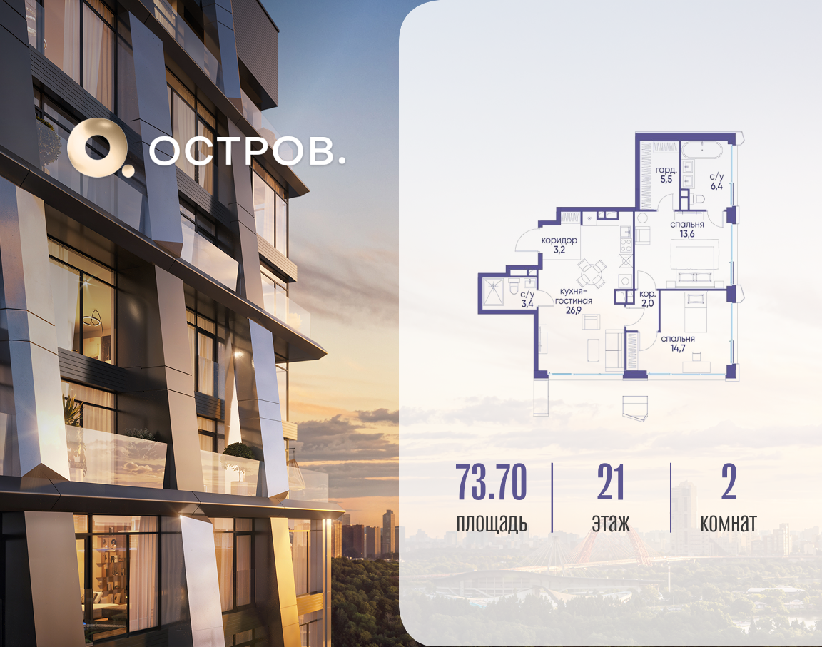Продаётся двухкомнатная квартира от застройщика: общая площадь 73.72 м², жилая 28.30 м², кухня 26.90 м², 21, жилой квартал «Остров 12», корпус 3 (12.1 квартал) (секция 1). срок сдачи: 4-кв. 2025. , 2 санузла: 2 совмещенных. В жилой зоне 2 больших окна на одну сторону, хорошая инсоляция. Позвоните сейчас и забронируйте квартиру! Купите квартиру для курортной жизни в Москве в квартале ОСТРОВ.12.1. Это единственный на ОСТРОВЕ квартал бизнес-класса, расположенный на первой линии у реки - здесь царит атмосфера ежедневного отпуска. Дома созданы в узнаваемом футуристичном стиле и выглядят как произведения современного искусства. Для жителей предусмотрены фитнес-рум и детский клуб, гостиная и кинотеатр, переговорные и репетиторские комнаты. На крышах устроены видовые общественные пространства с зонами для йоги, коворкингами, лаунжами. Двор-парк располагает всем необходимым для отдыха и общения всех возрастов. ОСТРОВ.12.1 - часть жилого комплекса на западе Москвы, в 15 минутах езды от центра. Это настоящий заповедник посреди большого города, в окружении реки и 650 га заповедников. Здесь все необходимое находится по соседству: от детского сада до супермаркета, от фитнес-зала до серфинг-центра. На территории созданы все условия для отдыха и общения: клубная инфраструктура в домах и дворы-парки, набережные и променады, маршруты для спортсменов, детей и возрастных жителей. В нескольких минутах ходьбы расположена станция метро "Мнёвники" БКЛ. На автомобиле - 10 минут до Москва-Сити и 15 минут до Садового кольца.