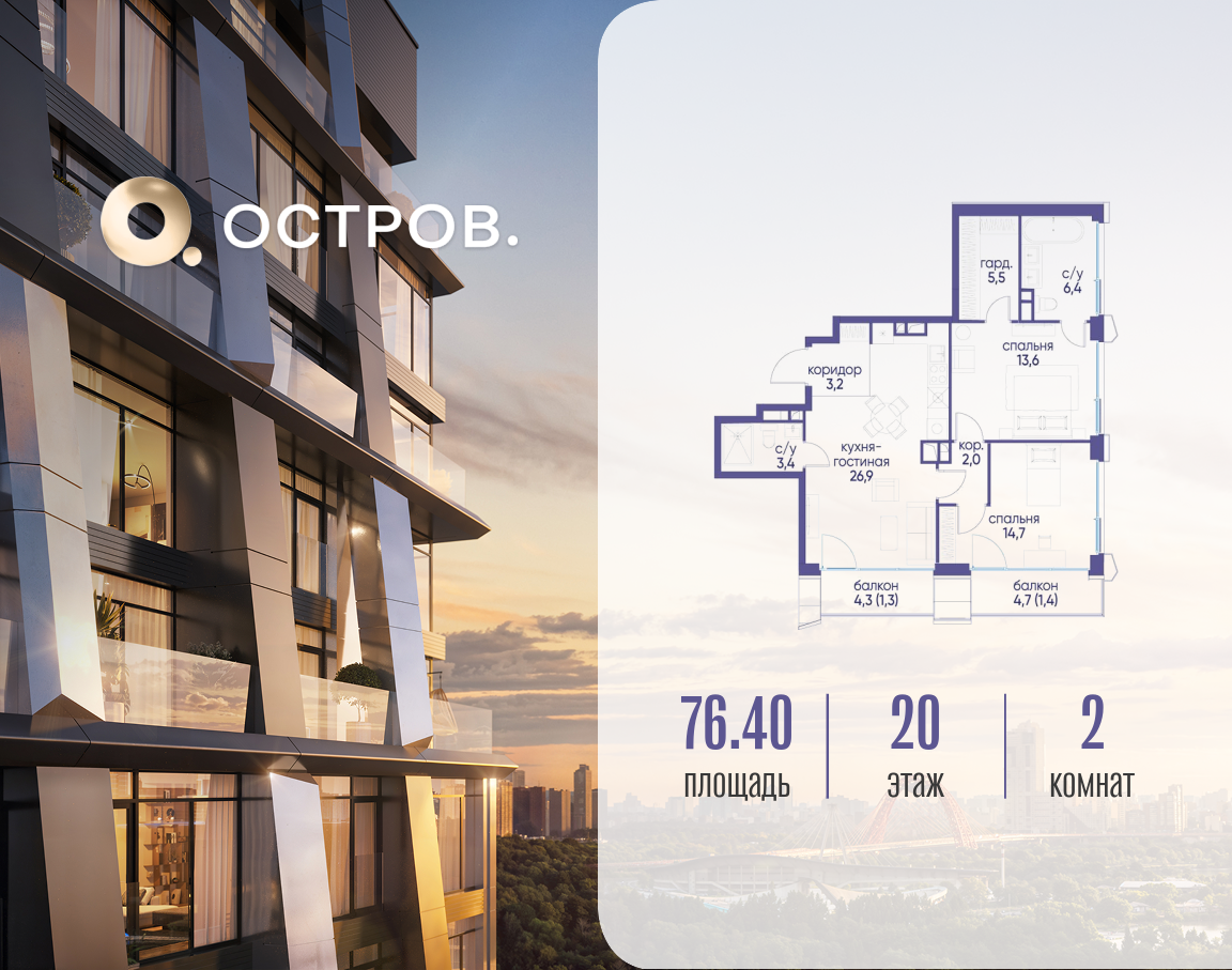 Продаётся двухкомнатная квартира от застройщика: общая площадь 76.42 м², жилая 28.30 м², кухня 26.90 м², 20, жилой квартал «Остров 12», корпус 3 (12.1 квартал) (секция 1). срок сдачи: 4-кв. 2025. , 2 санузла: 2 совмещенных. В жилой зоне 2 больших окна на одну сторону, хорошая инсоляция. Позвоните сейчас и забронируйте квартиру! Купите квартиру для курортной жизни в Москве в квартале ОСТРОВ.12.1. Это единственный на ОСТРОВЕ квартал бизнес-класса, расположенный на первой линии у реки - здесь царит атмосфера ежедневного отпуска. Дома созданы в узнаваемом футуристичном стиле и выглядят как произведения современного искусства. Для жителей предусмотрены фитнес-рум и детский клуб, гостиная и кинотеатр, переговорные и репетиторские комнаты. На крышах устроены видовые общественные пространства с зонами для йоги, коворкингами, лаунжами. Двор-парк располагает всем необходимым для отдыха и общения всех возрастов. ОСТРОВ.12.1 - часть жилого комплекса на западе Москвы, в 15 минутах езды от центра. Это настоящий заповедник посреди большого города, в окружении реки и 650 га заповедников. Здесь все необходимое находится по соседству: от детского сада до супермаркета, от фитнес-зала до серфинг-центра. На территории созданы все условия для отдыха и общения: клубная инфраструктура в домах и дворы-парки, набережные и променады, маршруты для спортсменов, детей и возрастных жителей. В нескольких минутах ходьбы расположена станция метро "Мнёвники" БКЛ. На автомобиле - 10 минут до Москва-Сити и 15 минут до Садового кольца.