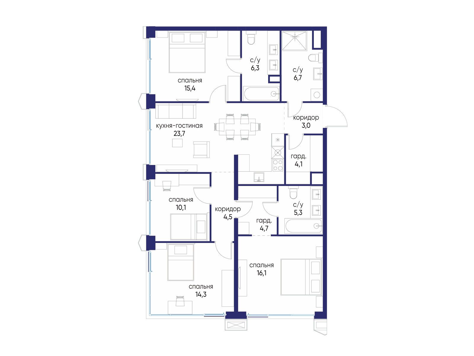 • Площадь кухни 23.7 м²