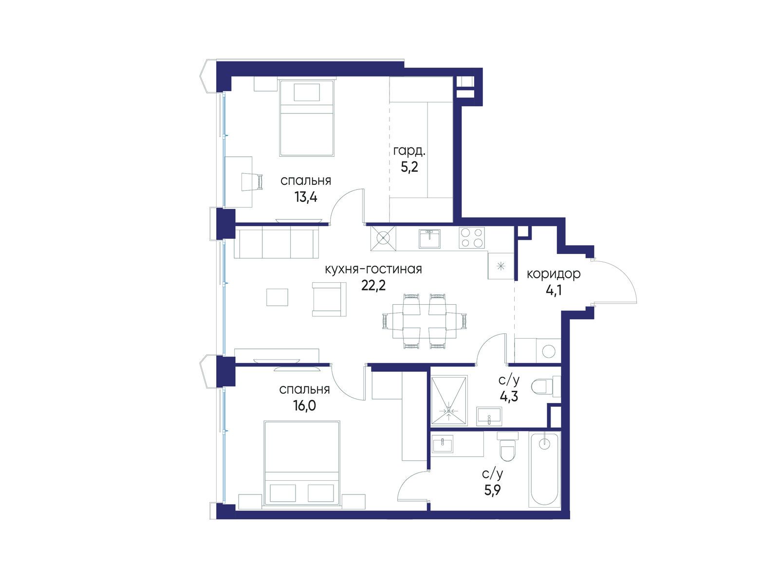 - Площадь кухни 22.2 м²