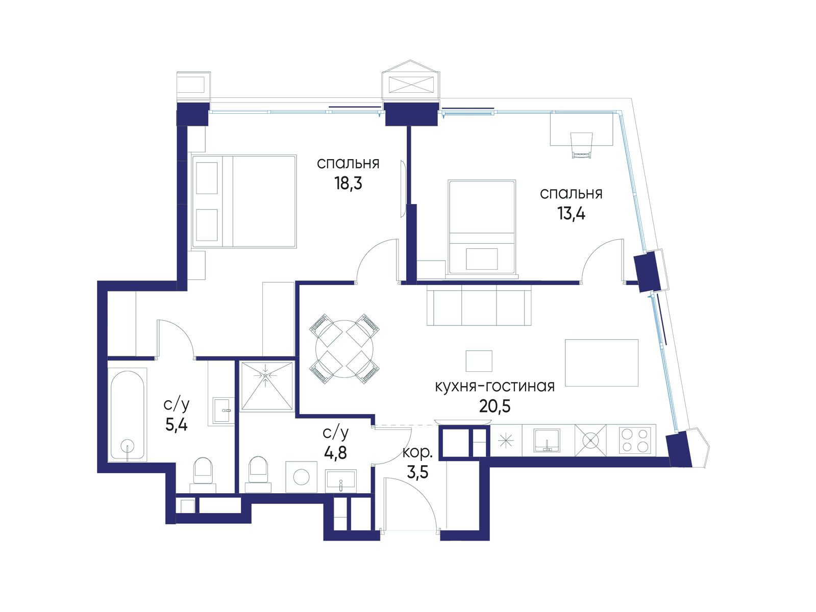 • Площадь кухни 20.5 м²