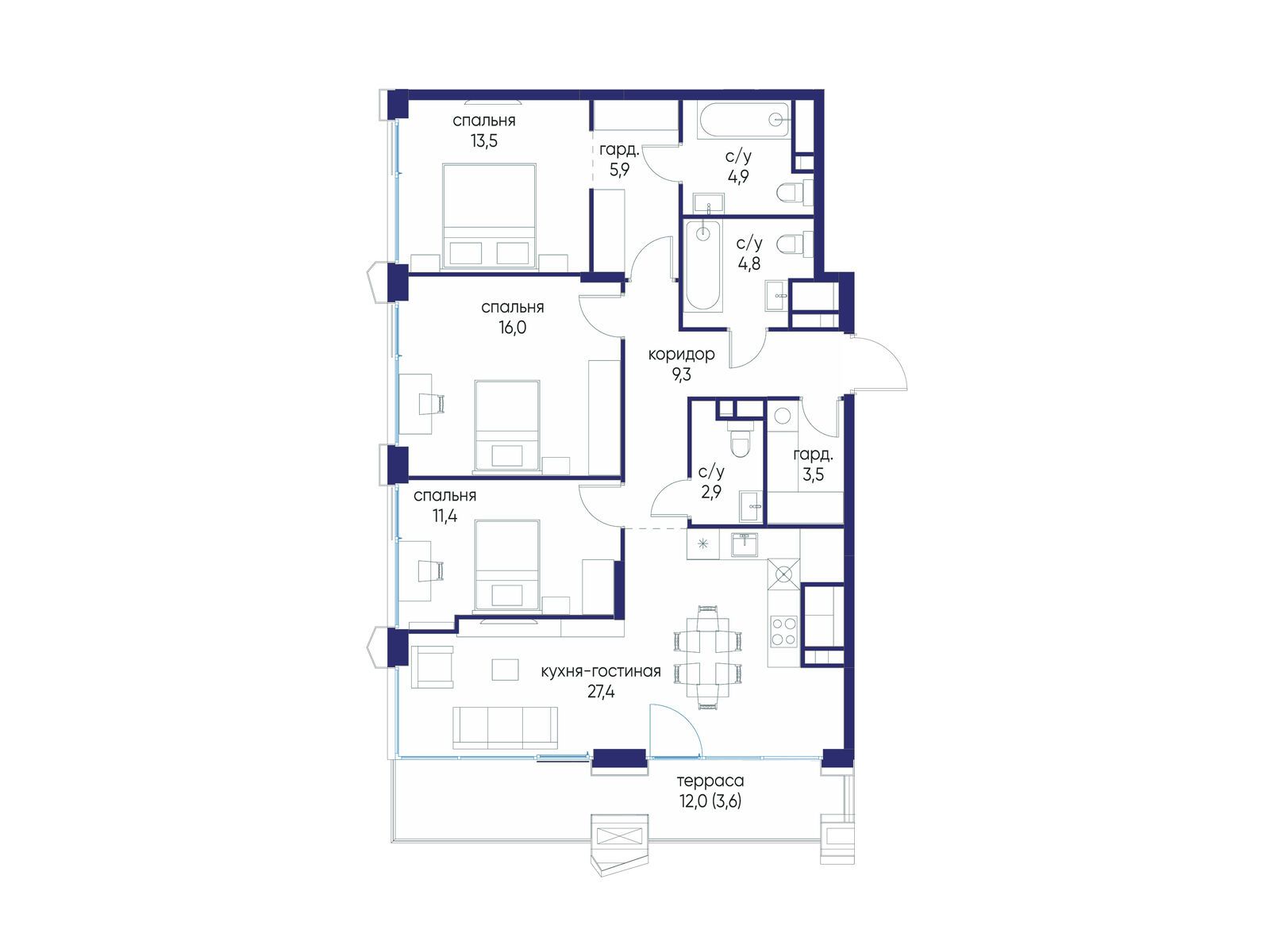 Квартира 3-комн., 103 м2, 20/24 этаж,