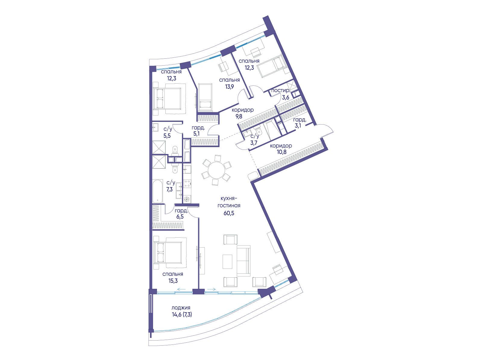 - Площадь кухни 60.5 м²