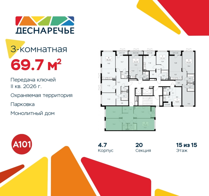 3-комн. квартира с отделкой в ЖК "Деснаречье" на 15 этаже. Общая площадь: 69.7 кв.м., жилая: 39 кв.м., площадь просторной кухни-столовой: 12.1 кв.м. Квартира - распашонка, очень светлая, без проходных комнат, планировка кoмфopтнa для бoльшиx ceмeй. В квартире одна лоджия, один совмещенный и один раздельный санузел. Высота потолков 2.99 м. Эта квартира будет сдана с дизайнеркой отделкой "под ключ". Специально для вас мы разработали несколько решений дизайнерской отделки. В отделке используются только современный высококлассные материалы, на все работы предоставляется гарантия. В таком случае вы оплачиваете отделку в сегодняшних ценах, а эту стоимость вы можете разнести в ипотечных платежах. Имеется ниша под гардероб. Дом монолитный, трехподъездный, высотой 15 этажей. Квартира находится во 2-й секции в корпусе 4.7. На этаже 6 квартир. В подъезде 1 пассажирский и 1 грузовой лифт. Начало строительства - 3 квартал 2023 года. Окончание строительства - 2 квартал 2026 года. Оформление сделки по договору долевого участия. Артикул квартиры по базе застройщика 88К-4.7-1606. Масштабный проект "Деснаречье" на юго-западе Москвы, который включает три новых района («квартала»), объединённые общей идеей – воплотить в реальность мечты современных жителей столицы об интересном, комфортном и разноплановом городском пространстве в окружении рек и лесов, словно сошедших с полотен русских живописцев: - «Берег» оценят все, кому близка водная стихия: плеск волн, солнечные блики и прогулки вдоль тихого течения речи. - «Лес» утопает в зелени парков и лесов. Здесь соблюдён идеальный баланс загородного спокойствия и столичного комфорта. - «Парк», самый энергичный и яркий, отличается высокой концентрацией пространств для спорта и творчества. Жилой комплекс "Деснаречье" расположится в 12 км от МКАД по современному Калужскому шоссе. Внешний облик зданий соответствует современному стилю и стандартам, характерным и для других популярных проектов ГК «А101»: сочетание контрастных тонов, большое количество остекления, в котором отражается небо, гармония с природным окружением. Весь город - в вашем районе. Находиться на территории «15-минутного города» значит иметь всё необходимое для полноценной жизни в шаговой доступности. Маршруты в районе «Деснаречье» выстроены так, чтобы добраться до магазинов, парков, школ, салонов услуг и других объектов можно было всего за несколько минут пешком или на велосипеде. Двор закрытый от машин – это тишина, комфорт и безопасность, поэтому все машино-места (включая «семейные» и увеличенные, с возможностью установки роллетных шкафов) находятся в подземном паркинге. В паркинги можно спуститься на лифте из любого подъезда или по лестнице. Рядом с «Деснаречьем» в 2027 году планируется открытие станции метро «Десна», до которой будет удобно добраться пешком или на велосипеде. Дорога на автомобиле до перехватывающих парковок станций «Ольховая» и «Прокшино» займёт около 10 минут. В процессе реализации проекта будут появляться новые маршруты общественного транспорта по районам. Уже сейчас на Калужском шоссе развита сеть наземного транспорта: два десятка автобусов и маршрутных такси прибывают на остановки с интервалом 5–10 минут. (AQID02264908)
