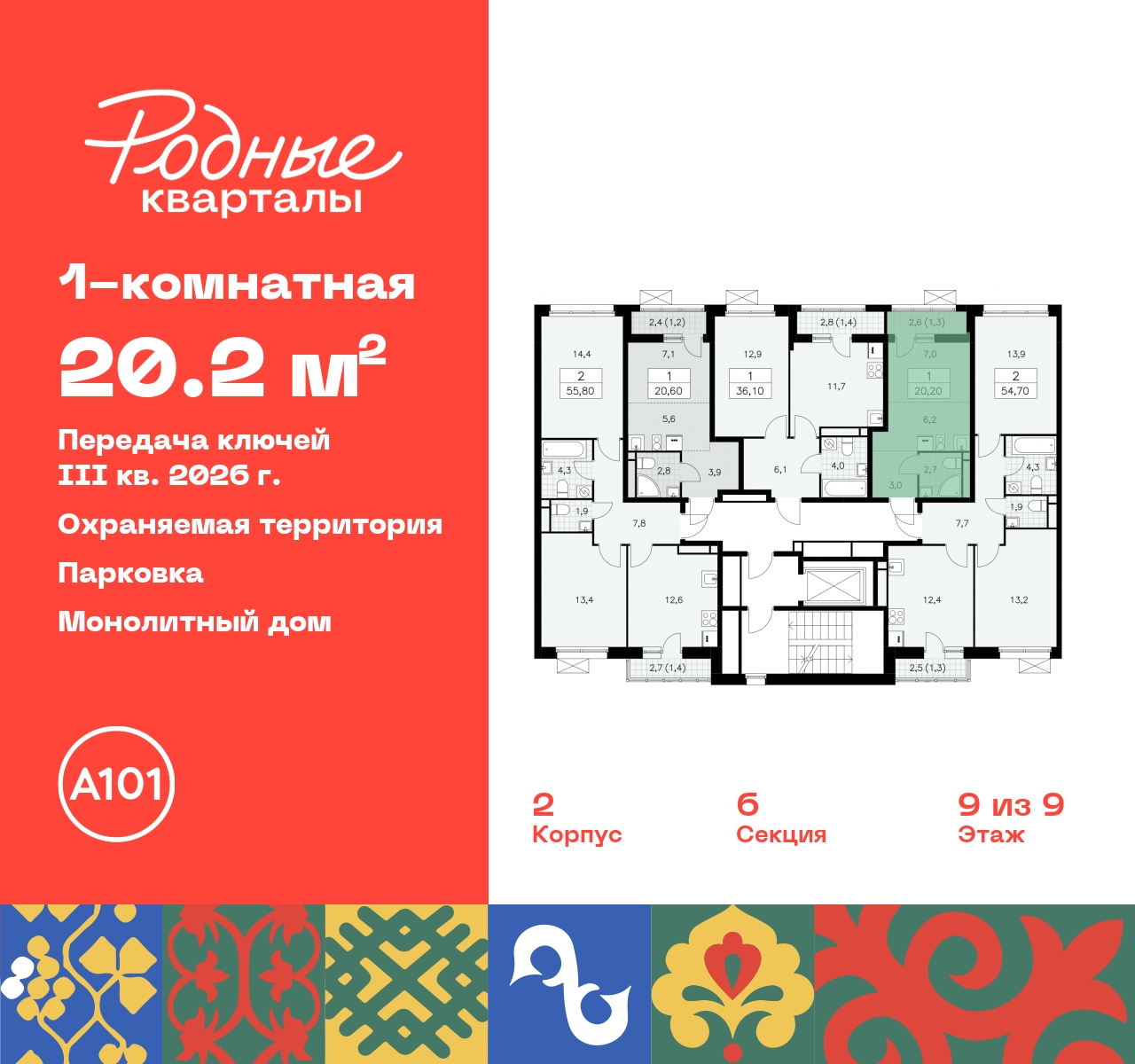 1-комн. квартира-студия в ЖК "Родные кварталы" на 9 этаже. Квартира без отделки, полностью готова к чистовой отделке и дальнейшему ремонту. Общая площадь: 20.2 кв.м., площадь гостиной 13.2 кв.м., из которых 6.2 кв.м. выделено под кухонную зону. Все окна выходят на одну сторону. В квартире один балкон, один совмещенный санузел. Высота потолков 2.9 м. Дом монолитный, многоподъездный, высотой 9 этажей. Квартира находится в 6-й секции в корпусе 2. На этаже 5 квартир. В подъезде 1 грузовой лифт. Начало строительства - 4 квартал 2023 года. Окончание строительства - 3 квартал 2026 года. Оформление сделки по договору долевого участия. Артикул квартиры по базе застройщика 96К-2-279. Новый жилой комплекс "Родные кварталы" строится в уютной, экологически благополучной локации на юго-западе столицы. В ближайшем окружении – ухоженные малоэтажные посёлки и живописный Ульяновский лесопарк. Благодаря этому из окон откроются вдохновляющие виды, которые не исчезнут со временем за фасадами многоэтажек. Через весь район пройдёт главный бульвар, который свяжет набережную, жилые кварталы и площади в единое дружелюбное пространство, органично наполненное узнаваемыми элементами культурных традиций разных народов. В жилом комплексе создаются условия для комфортного отдыха и занятий спортом всех жителей. Здесь можно прогуляться и отдохнуть в лесопарке на берегу ручья, позаниматься на тренажёрах под открытым небом и спортивных площадках. Для малышей построят игровые комплексы, развивающие силу, координацию и ловкость. Всего в жилом комплексе будет оборудовано 6 га территории для спокойного отдыха и около 9 га — для активного. Подъезды в домах освещены в любое время суток, входы и вестибюль хорошо просматриваются с улицы. Витражное остекление обеспечивает приток естественного света днём, а вечером зажигаются светильники. В отделке домов используется сочетание вентилируемого фасада с облицовкой из фибробетонной плитки и штукатуркой. Комфортная высота домов соразмерна человеку и в среднем составляет 10 этажей. Все дома обеспечены собственными подземными паркингами. В них размещаются машино-места и кладовые. В паркинг или кладовую можно спуститься на лифте или по лестнице. В комплексе появятся бытовые сервисы, магазины, аптеки и другие торгово-бытовые объекты. В жилом районе «Родные кварталы» будут построены: - образовательный центр: школа на 1300 учеников и детский сад на 250 малышей, - два детских сада на 200 мест каждый (один из них сдаётся в 1-й очереди). В транспортной доступности уже работают: - школа № 41 и детский сад — по Боровскому шоссе, - школа № 2057 и детский сад — на запад от района, в дер. Марушкино. ЖК «Родные кварталы» строится в Новомосковском округе столицы, в 15 минутах на автомобиле от аэропорта «Внуково». Район обеспечен удобными выездами на три крупные современные автотрассы. Здесь уже работает и активно развивается система наземного общественного транспорта, включая междугородние рейсы. Интенсивное развитие локации обеспечивают две действующие станции крупных транспортных линий: метро (станция «Внуково») и МЦД (станция «Толстопальцево»). (AQID02295597)