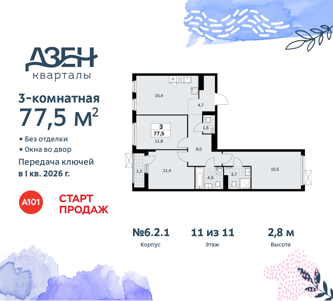 - Общая площадь 77.5 м²
