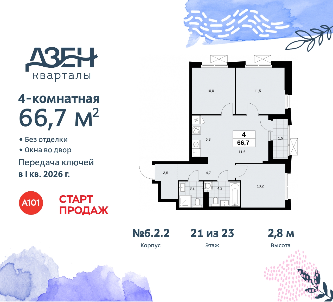 4-комн. квартира с европланировкой от застройщика в ЖК "Дзен-кварталы" на 21 этаже. Квартира без отделки, полностью готова к чистовой отделке и дальнейшему ремонту. Общая площадь: 66.7 кв.м., жилая: 43.3 кв.м., общая площадь гостиной-столовой с кухонной зоной: 17.9 кв.м. Европланировка, за счет большой площади кухни-гостиной квартира выглядит просторной и очень удобна для жизни. Угловая квартира, окна oбecпeчивaют paвнoмepнoe ocвeщeниe в тeчeниe дня. В квартире одна лоджия, два совмещенных санузла. Высота потолков 2.8 м. Эта квартира предлагается без отделки. Будут установлены стеклопакеты с повышенной тепло- и шумоизоляцией, в квартиру заведены все коммуникации. Вы сможете в полном объеме реализовать ваши идеи обустройства вашего комфортного дома. Имеется ниша под гардероб. Квартира находится в корпусе 6.2.2. Дом монолитный, одноподъездный, высотой 23 этажа. На этаже 10 квартир. В подъезде 1 пассажирский и 2 грузовых лифта. Начало строительства - 4 квартал 2023 года. Окончание строительства - 1 квартал 2026 года. Оформление сделки по договору долевого участия. Артикул квартиры по базе застройщика 41К-6.2.2-509. В шаговой доступности от жилого комплекса имеются станции метро (расстояние по прямой): «Новомосковская (Коммунарка)» (800 м), «Новомосковская» (800 м), «Потапово» (1.1 км), также недалеко от этого корпуса находятся станции метро: «Коммунарка», «Улица Горчакова», «Бульвар адмирала Ушакова», «Ольховая», «Бунинская аллея». Новый район «Дзен-кварталы» возводится на юго-западе столицы – вдоль береговой линии живописного Ивановского пруда и реки Варварки. В основе проекта – «сочетание несочетаемого», гармония простого и утончённого, природного и урбанистического – стиль Japandi, объединяющий скандинавскую функциональность и восточную созерцательность. В приятном соседстве с домами нового района живописный Ивановский пруд — его береговая линия проходит по территории «Дзен-кварталов». Здесь будет благоустроена набережная для отдыха жителей нового района — по авторскому проекту Группы компаний «А101». На территории района появятся два детских сада и крупный образовательный комплекс, в состав которого войдут детский сад и школа. Все они будут спроектированы на основе собственной концепции образовательной среды ГК «А101», разработанной экспертами в области педагогики, детский психологии и эргономики учебных пространств. Фасадные решения выполнены в современном архитектурном стиле, основанном на сочетании японского минимализма и скандинавской функциональности. Использованы природные оттенки спокойного японского пейзажа, материалы, имитирующие натуральные поверхности – штукатурка, облицовочная плитка разных размеров и текстур. Подобный стилистический подход делает пространство созерцательными и гармоничным. Для комфортного хранения габаритных и сезонных вещей на уровне подземного этажа спланированы удобные кладовые помещения. Доступ в них осуществляется на лифте. Отличная транспортная доступность. 2 станции метро, "Коммунарка" и "Потапово" в минутной шаговой доступности. Обстановки общественного транспорт, транспортные развязки и удобный выезд на трассу Солнцево – Бутово – Варшавское шоссе. (AQID02328812)