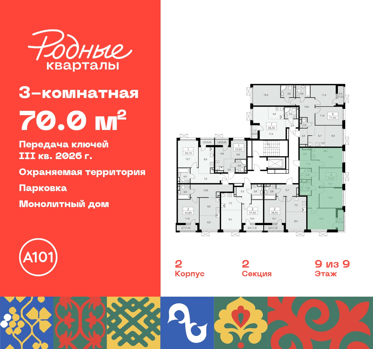 Трехкомнатная квартира в ЖК "Родные кварталы" на 9 этаже. Квартира без отделки, полностью готова к чистовой отделке и дальнейшему ремонту. Общая площадь: 70 кв.м., жилая: 34.8 кв.м., площадь просторной кухни-столовой: 12.9 кв.м. Угловая квартира, окна oбecпeчивaют paвнoмepнoe ocвeщeниe в тeчeниe дня. В квартире одна лоджия, два совмещенных санузла. Высота потолков 2.9 м. Имеется ниша под гардероб. Дом монолитный, многоподъездный, высотой 9 этажей. Квартира находится во 2-й секции в корпусе 2. На этаже 8 квартир. В подъезде 1 грузовой лифт. Начало строительства - 4 квартал 2023 года. Окончание строительства - 3 квартал 2026 года. Оформление сделки по договору долевого участия. Артикул квартиры по базе застройщика 96К-2-99. Новый жилой комплекс "Родные кварталы" строится в уютной, экологически благополучной локации на юго-западе столицы. В ближайшем окружении – ухоженные малоэтажные посёлки и живописный Ульяновский лесопарк. Благодаря этому из окон откроются вдохновляющие виды, которые не исчезнут со временем за фасадами многоэтажек. Через весь район пройдёт главный бульвар, который свяжет набережную, жилые кварталы и площади в единое дружелюбное пространство, органично наполненное узнаваемыми элементами культурных традиций разных народов. В жилом комплексе создаются условия для комфортного отдыха и занятий спортом всех жителей. Здесь можно прогуляться и отдохнуть в лесопарке на берегу ручья, позаниматься на тренажёрах под открытым небом и спортивных площадках. Для малышей построят игровые комплексы, развивающие силу, координацию и ловкость. Всего в жилом комплексе будет оборудовано 6 га территории для спокойного отдыха и около 9 га — для активного. Подъезды в домах освещены в любое время суток, входы и вестибюль хорошо просматриваются с улицы. Витражное остекление обеспечивает приток естественного света днём, а вечером зажигаются светильники. В отделке домов используется сочетание вентилируемого фасада с облицовкой из фибробетонной плитки и штукатуркой. Комфортная высота домов соразмерна человеку и в среднем составляет 10 этажей. Все дома обеспечены собственными подземными паркингами. В них размещаются машино-места и кладовые. В паркинг или кладовую можно спуститься на лифте или по лестнице. В комплексе появятся бытовые сервисы, магазины, аптеки и другие торгово-бытовые объекты. В жилом районе «Родные кварталы» будут построены: - образовательный центр: школа на 1300 учеников и детский сад на 250 малышей, - два детских сада на 200 мест каждый (один из них сдаётся в 1-й очереди). В транспортной доступности уже работают: - школа № 41 и детский сад — по Боровскому шоссе, - школа № 2057 и детский сад — на запад от района, в дер. Марушкино. ЖК «Родные кварталы» строится в Новомосковском округе столицы, в 15 минутах на автомобиле от аэропорта «Внуково». Район обеспечен удобными выездами на три крупные современные автотрассы. Здесь уже работает и активно развивается система наземного общественного транспорта, включая междугородние рейсы. Интенсивное развитие локации обеспечивают две действующие станции крупных транспортных линий: метро (станция «Внуково») и МЦД (станция «Толстопальцево»). (AQID02295417)