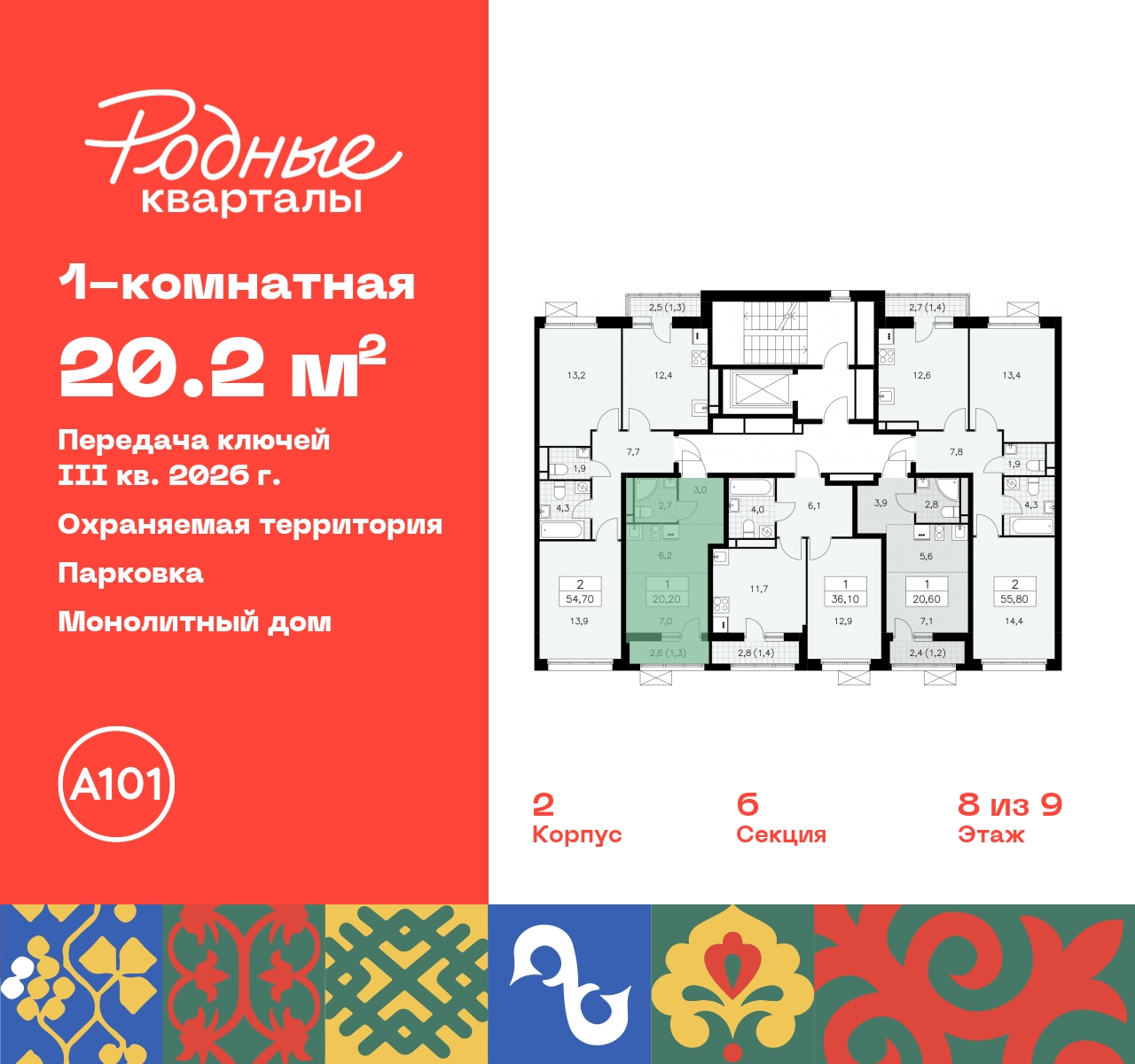 Просторная 1-комн. квартира-студия в ЖК "Родные кварталы" на 8 этаже. Квартира без отделки, после получения ключей можно делать ремонт. Общая площадь: 20.2 кв.м., площадь гостиной 13.2 кв.м., из которых 6.2 кв.м. выделено под кухонную зону. Все окна выходят на одну сторону. В квартире один балкон, один совмещенный санузел. Высота потолков 2.9 м. Дом монолитный, многоподъездный, высотой 9 этажей. Квартира находится в 6-й секции в корпусе 2. На этаже 5 квартир. В подъезде 1 грузовой лифт. Начало строительства - 4 квартал 2023 года. Окончание строительства - 3 квартал 2026 года. Оформление сделки по договору долевого участия. Артикул квартиры по базе застройщика 96К-2-274. Новый жилой комплекс "Родные кварталы" строится в уютной, экологически благополучной локации на юго-западе столицы. В ближайшем окружении – ухоженные малоэтажные посёлки и живописный Ульяновский лесопарк. Благодаря этому из окон откроются вдохновляющие виды, которые не исчезнут со временем за фасадами многоэтажек. Через весь район пройдёт главный бульвар, который свяжет набережную, жилые кварталы и площади в единое дружелюбное пространство, органично наполненное узнаваемыми элементами культурных традиций разных народов. В жилом комплексе создаются условия для комфортного отдыха и занятий спортом всех жителей. Здесь можно прогуляться и отдохнуть в лесопарке на берегу ручья, позаниматься на тренажёрах под открытым небом и спортивных площадках. Для малышей построят игровые комплексы, развивающие силу, координацию и ловкость. Всего в жилом комплексе будет оборудовано 6 га территории для спокойного отдыха и около 9 га — для активного. Подъезды в домах освещены в любое время суток, входы и вестибюль хорошо просматриваются с улицы. Витражное остекление обеспечивает приток естественного света днём, а вечером зажигаются светильники. В отделке домов используется сочетание вентилируемого фасада с облицовкой из фибробетонной плитки и штукатуркой. Комфортная высота домов соразмерна человеку и в среднем составляет 10 этажей. Все дома обеспечены собственными подземными паркингами. В них размещаются машино-места и кладовые. В паркинг или кладовую можно спуститься на лифте или по лестнице. В комплексе появятся бытовые сервисы, магазины, аптеки и другие торгово-бытовые объекты. В жилом районе «Родные кварталы» будут построены: - образовательный центр: школа на 1300 учеников и детский сад на 250 малышей, - два детских сада на 200 мест каждый (один из них сдаётся в 1-й очереди). В транспортной доступности уже работают: - школа № 41 и детский сад — по Боровскому шоссе, - школа № 2057 и детский сад — на запад от района, в дер. Марушкино. ЖК «Родные кварталы» строится в Новомосковском округе столицы, в 15 минутах на автомобиле от аэропорта «Внуково». Район обеспечен удобными выездами на три крупные современные автотрассы. Здесь уже работает и активно развивается система наземного общественного транспорта, включая междугородние рейсы. Интенсивное развитие локации обеспечивают две действующие станции крупных транспортных линий: метро (станция «Внуково») и МЦД (станция «Толстопальцево»). (AQID02295592)