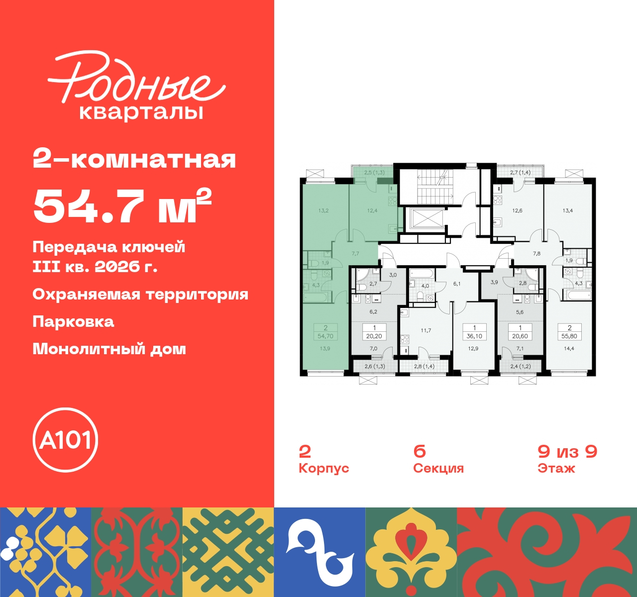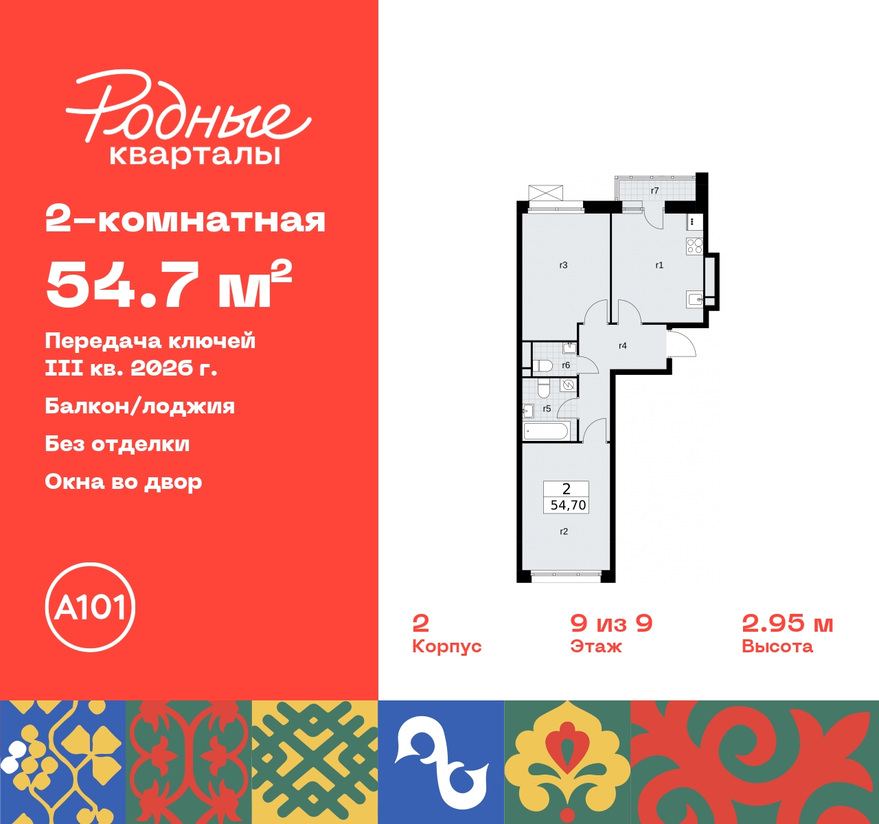 Продается 2-комн. квартира в ЖК "Родные кварталы" на 9 этаже. Квартира без отделки, новый собственник может сделать ремонт по своему проекту. Общая площадь: 54.7 кв.м., жилая: 27.1 кв.м., площадь просторной кухни-столовой: 12.4 кв.м. Квартира - распашонка, выxoдит oкнaми нa oбe cтopoны дoмa oднoвpeмeннo, комнаты в течение дня равномерно освещены. В квартире один балкон, один совмещенный и один раздельный санузел. Высота потолков 2.9 м. Дом монолитный, многоподъездный, высотой 9 этажей. Квартира находится в 6-й секции в корпусе 2. На этаже 5 квартир. В подъезде 1 грузовой лифт. Начало строительства - 4 квартал 2023 года. Окончание строительства - 3 квартал 2026 года. Оформление сделки по договору долевого участия. Артикул квартиры по базе застройщика 96К-2-280. Новый жилой комплекс "Родные кварталы" строится в уютной, экологически благополучной локации на юго-западе столицы. В ближайшем окружении – ухоженные малоэтажные посёлки и живописный Ульяновский лесопарк. Благодаря этому из окон откроются вдохновляющие виды, которые не исчезнут со временем за фасадами многоэтажек. Через весь район пройдёт главный бульвар, который свяжет набережную, жилые кварталы и площади в единое дружелюбное пространство, органично наполненное узнаваемыми элементами культурных традиций разных народов. В жилом комплексе создаются условия для комфортного отдыха и занятий спортом всех жителей. Здесь можно прогуляться и отдохнуть в лесопарке на берегу ручья, позаниматься на тренажёрах под открытым небом и спортивных площадках. Для малышей построят игровые комплексы, развивающие силу, координацию и ловкость. Всего в жилом комплексе будет оборудовано 6 га территории для спокойного отдыха и около 9 га — для активного. Подъезды в домах освещены в любое время суток, входы и вестибюль хорошо просматриваются с улицы. Витражное остекление обеспечивает приток естественного света днём, а вечером зажигаются светильники. В отделке домов используется сочетание вентилируемого фасада с облицовкой из фибробетонной плитки и штукатуркой. Комфортная высота домов соразмерна человеку и в среднем составляет 10 этажей. Все дома обеспечены собственными подземными паркингами. В них размещаются машино-места и кладовые. В паркинг или кладовую можно спуститься на лифте или по лестнице. В комплексе появятся бытовые сервисы, магазины, аптеки и другие торгово-бытовые объекты. В жилом районе «Родные кварталы» будут построены: - образовательный центр: школа на 1300 учеников и детский сад на 250 малышей, - два детских сада на 200 мест каждый (один из них сдаётся в 1-й очереди). В транспортной доступности уже работают: - школа № 41 и детский сад — по Боровскому шоссе, - школа № 2057 и детский сад — на запад от района, в дер. Марушкино. ЖК «Родные кварталы» строится в Новомосковском округе столицы, в 15 минутах на автомобиле от аэропорта «Внуково». Район обеспечен удобными выездами на три крупные современные автотрассы. Здесь уже работает и активно развивается система наземного общественного транспорта, включая междугородние рейсы. Интенсивное развитие локации обеспечивают две действующие станции крупных транспортных линий: метро (станция «Внуково») и МЦД (станция «Толстопальцево»). (AQID02295598)