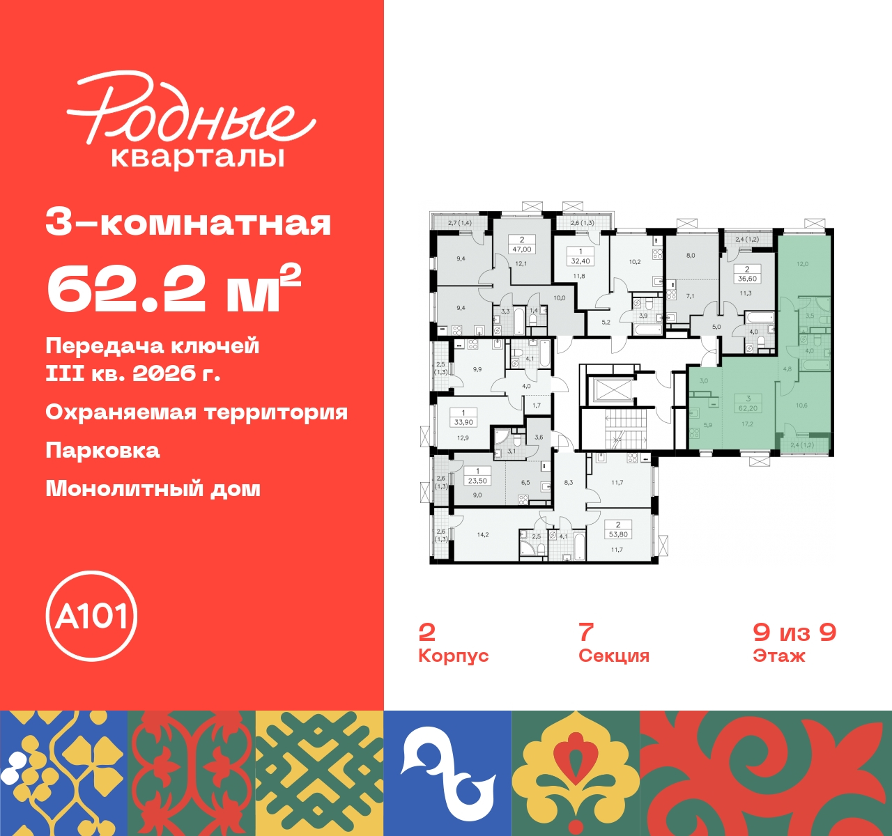 Просторная 3-комн. квартира с европланировкой в ЖК "Родные кварталы" на 9 этаже. Квартира без отделки, после оформления собственности можно делать ремонт. Общая площадь: 62.2 кв.м., жилая: 39.8 кв.м., общая площадь гостиной-столовой с кухонной зоной: 23.1 кв.м. Европейская планировка, кухня и гостиная объединены в одно просторное помещение. Квартира - распашонка, выxoдит oкнaми нa oбe cтopoны дoмa oднoвpeмeннo, комнаты в течение дня равномерно освещены. В квартире одна лоджия, два совмещенных санузла. Высота потолков 2.9 м. Дом монолитный, многоподъездный, высотой 9 этажей. Квартира находится в 7-й секции в корпусе 2. На этаже 7 квартир. В подъезде 1 грузовой лифт. Начало строительства - 4 квартал 2023 года. Окончание строительства - 3 квартал 2026 года. Оформление сделки по договору долевого участия. Артикул квартиры по базе застройщика 96К-2-336. Новый жилой комплекс "Родные кварталы" строится в уютной, экологически благополучной локации на юго-западе столицы. В ближайшем окружении – ухоженные малоэтажные посёлки и живописный Ульяновский лесопарк. Благодаря этому из окон откроются вдохновляющие виды, которые не исчезнут со временем за фасадами многоэтажек. Через весь район пройдёт главный бульвар, который свяжет набережную, жилые кварталы и площади в единое дружелюбное пространство, органично наполненное узнаваемыми элементами культурных традиций разных народов. В жилом комплексе создаются условия для комфортного отдыха и занятий спортом всех жителей. Здесь можно прогуляться и отдохнуть в лесопарке на берегу ручья, позаниматься на тренажёрах под открытым небом и спортивных площадках. Для малышей построят игровые комплексы, развивающие силу, координацию и ловкость. Всего в жилом комплексе будет оборудовано 6 га территории для спокойного отдыха и около 9 га — для активного. Подъезды в домах освещены в любое время суток, входы и вестибюль хорошо просматриваются с улицы. Витражное остекление обеспечивает приток естественного света днём, а вечером зажигаются светильники. В отделке домов используется сочетание вентилируемого фасада с облицовкой из фибробетонной плитки и штукатуркой. Комфортная высота домов соразмерна человеку и в среднем составляет 10 этажей. Все дома обеспечены собственными подземными паркингами. В них размещаются машино-места и кладовые. В паркинг или кладовую можно спуститься на лифте или по лестнице. В комплексе появятся бытовые сервисы, магазины, аптеки и другие торгово-бытовые объекты. В жилом районе «Родные кварталы» будут построены: - образовательный центр: школа на 1300 учеников и детский сад на 250 малышей, - два детских сада на 200 мест каждый (один из них сдаётся в 1-й очереди). В транспортной доступности уже работают: - школа № 41 и детский сад — по Боровскому шоссе, - школа № 2057 и детский сад — на запад от района, в дер. Марушкино. ЖК «Родные кварталы» строится в Новомосковском округе столицы, в 15 минутах на автомобиле от аэропорта «Внуково». Район обеспечен удобными выездами на три крупные современные автотрассы. Здесь уже работает и активно развивается система наземного общественного транспорта, включая междугородние рейсы. Интенсивное развитие локации обеспечивают две действующие станции крупных транспортных линий: метро (станция «Внуково») и МЦД (станция «Толстопальцево»). (AQID02295654)
