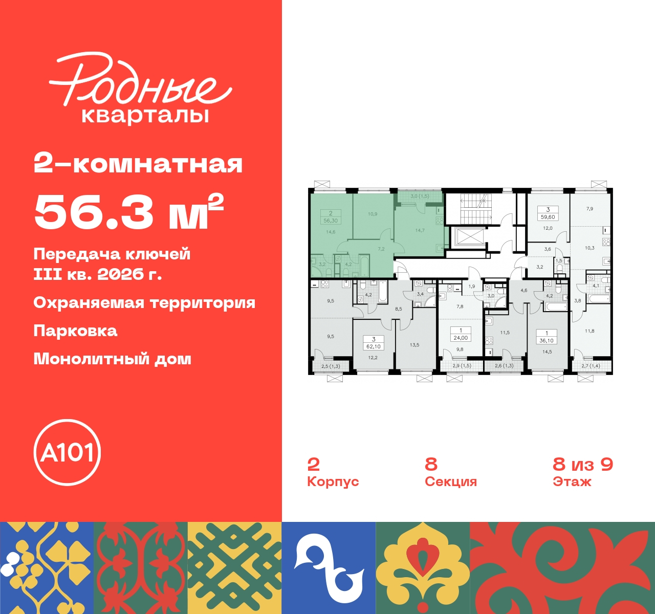 - Общая площадь 56.3 м²