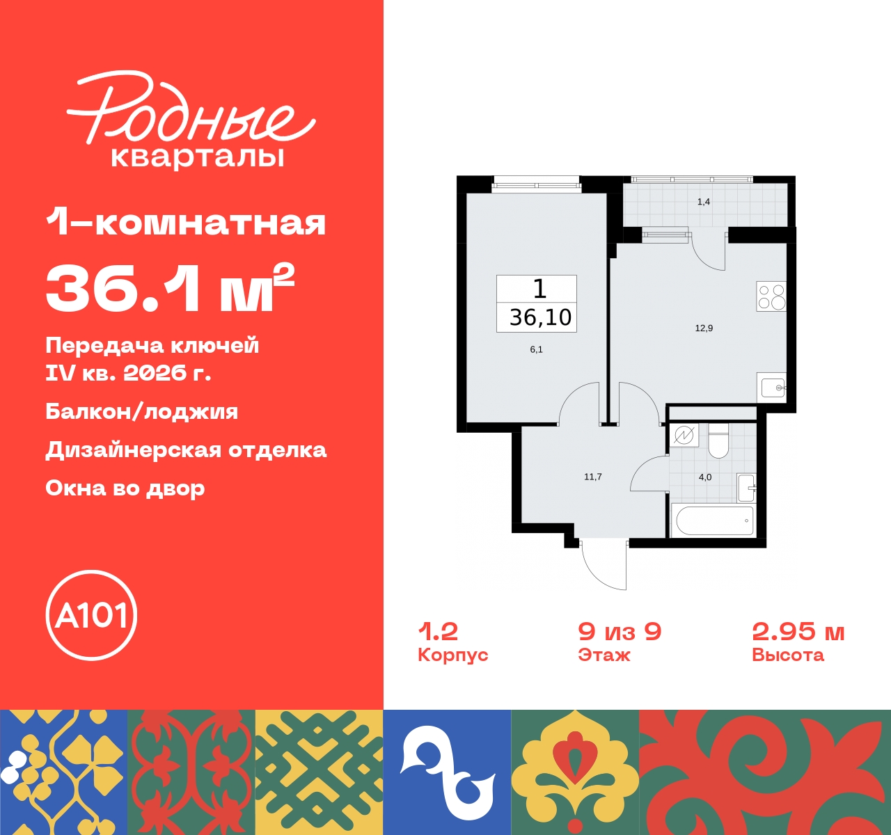 Однокомнатная квартира с отделкой в ЖК "Родные кварталы" на 9 этаже. Общая площадь: 36.1 кв.м., жилая: 11.7 кв.м., площадь просторной кухни-столовой: 12.9 кв.м. Все окна выходят на одну сторону. В квартире одна лоджия, один совмещенный санузел. Высота потолков 2.9 м. Дом монолитный, многоподъездный, высотой 9 этажей. Квартира находится в 6-й секции в корпусе 1.2. На этаже 5 квартир. В подъезде 1 грузовой лифт. Начало строительства - 4 квартал 2023 года. Окончание строительства - 4 квартал 2026 года. Оформление сделки по договору долевого участия. Артикул квартиры по базе застройщика 96К-1.2-385. Новый жилой комплекс "Родные кварталы" строится в уютной, экологически благополучной локации на юго-западе столицы. В ближайшем окружении – ухоженные малоэтажные посёлки и живописный Ульяновский лесопарк. Благодаря этому из окон откроются вдохновляющие виды, которые не исчезнут со временем за фасадами многоэтажек. Через весь район пройдёт главный бульвар, который свяжет набережную, жилые кварталы и площади в единое дружелюбное пространство, органично наполненное узнаваемыми элементами культурных традиций разных народов. В жилом комплексе создаются условия для комфортного отдыха и занятий спортом всех жителей. Здесь можно прогуляться и отдохнуть в лесопарке на берегу ручья, позаниматься на тренажёрах под открытым небом и спортивных площадках. Для малышей построят игровые комплексы, развивающие силу, координацию и ловкость. Всего в жилом комплексе будет оборудовано 6 га территории для спокойного отдыха и около 9 га — для активного. Подъезды в домах освещены в любое время суток, входы и вестибюль хорошо просматриваются с улицы. Витражное остекление обеспечивает приток естественного света днём, а вечером зажигаются светильники. В отделке домов используется сочетание вентилируемого фасада с облицовкой из фибробетонной плитки и штукатуркой. Комфортная высота домов соразмерна человеку и в среднем составляет 10 этажей. Все дома обеспечены собственными подземными паркингами. В них размещаются машино-места и кладовые. В паркинг или кладовую можно спуститься на лифте или по лестнице. В комплексе появятся бытовые сервисы, магазины, аптеки и другие торгово-бытовые объекты. В жилом районе «Родные кварталы» будут построены: - образовательный центр: школа на 1300 учеников и детский сад на 250 малышей, - два детских сада на 200 мест каждый (один из них сдаётся в 1-й очереди). В транспортной доступности уже работают: - школа № 41 и детский сад — по Боровскому шоссе, - школа № 2057 и детский сад — на запад от района, в дер. Марушкино. ЖК «Родные кварталы» строится в Новомосковском округе столицы, в 15 минутах на автомобиле от аэропорта «Внуково». Район обеспечен удобными выездами на три крупные современные автотрассы. Здесь уже работает и активно развивается система наземного общественного транспорта, включая междугородние рейсы. Интенсивное развитие локации обеспечивают две действующие станции крупных транспортных линий: метро (станция «Внуково») и МЦД (станция «Толстопальцево»). (AQID02318145)