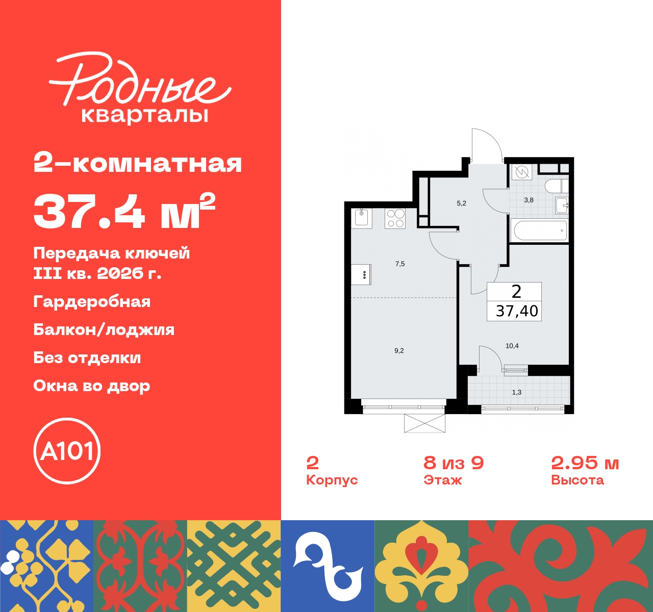 - Общая площадь 37.4 м²