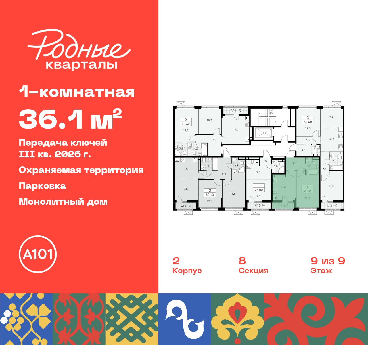 Продается 1-комн. квартира в ЖК "Родные кварталы" на 9 этаже. Квартира без отделки, после выдачи ключей можно делать ремонт. Общая площадь: 36.1 кв.м., жилая: 14.5 кв.м., площадь просторной кухни-столовой: 11.5 кв.м. Все окна выходят на одну сторону. В квартире одна лоджия, один совмещенный санузел. Высота потолков 2.9 м. Дом монолитный, многоподъездный, высотой 9 этажей. Квартира находится в 8-й секции в корпусе 2. На этаже 5 квартир. В подъезде 1 грузовой лифт. Начало строительства - 4 квартал 2023 года. Окончание строительства - 3 квартал 2026 года. Оформление сделки по договору долевого участия. Артикул квартиры по базе застройщика 96К-2-373. Новый жилой комплекс "Родные кварталы" строится в уютной, экологически благополучной локации на юго-западе столицы. В ближайшем окружении – ухоженные малоэтажные посёлки и живописный Ульяновский лесопарк. Благодаря этому из окон откроются вдохновляющие виды, которые не исчезнут со временем за фасадами многоэтажек. Через весь район пройдёт главный бульвар, который свяжет набережную, жилые кварталы и площади в единое дружелюбное пространство, органично наполненное узнаваемыми элементами культурных традиций разных народов. В жилом комплексе создаются условия для комфортного отдыха и занятий спортом всех жителей. Здесь можно прогуляться и отдохнуть в лесопарке на берегу ручья, позаниматься на тренажёрах под открытым небом и спортивных площадках. Для малышей построят игровые комплексы, развивающие силу, координацию и ловкость. Всего в жилом комплексе будет оборудовано 6 га территории для спокойного отдыха и около 9 га — для активного. Подъезды в домах освещены в любое время суток, входы и вестибюль хорошо просматриваются с улицы. Витражное остекление обеспечивает приток естественного света днём, а вечером зажигаются светильники. В отделке домов используется сочетание вентилируемого фасада с облицовкой из фибробетонной плитки и штукатуркой. Комфортная высота домов соразмерна человеку и в среднем составляет 10 этажей. Все дома обеспечены собственными подземными паркингами. В них размещаются машино-места и кладовые. В паркинг или кладовую можно спуститься на лифте или по лестнице. В комплексе появятся бытовые сервисы, магазины, аптеки и другие торгово-бытовые объекты. В жилом районе «Родные кварталы» будут построены: - образовательный центр: школа на 1300 учеников и детский сад на 250 малышей, - два детских сада на 200 мест каждый (один из них сдаётся в 1-й очереди). В транспортной доступности уже работают: - школа № 41 и детский сад — по Боровскому шоссе, - школа № 2057 и детский сад — на запад от района, в дер. Марушкино. ЖК «Родные кварталы» строится в Новомосковском округе столицы, в 15 минутах на автомобиле от аэропорта «Внуково». Район обеспечен удобными выездами на три крупные современные автотрассы. Здесь уже работает и активно развивается система наземного общественного транспорта, включая междугородние рейсы. Интенсивное развитие локации обеспечивают две действующие станции крупных транспортных линий: метро (станция «Внуково») и МЦД (станция «Толстопальцево»). (AQID02295691)