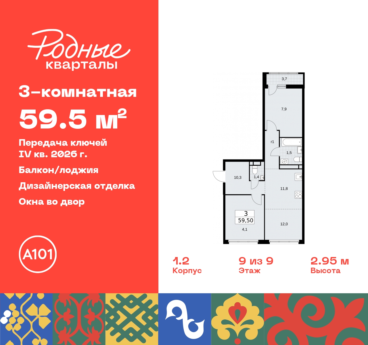Просторная 3-комн. квартира с европланировкой и отделкой в ЖК "Родные кварталы" на 9 этаже. Общая площадь: 59.5 кв.м., жилая: 34 кв.м., суммарная площадь гостиной-столовой с кухонной зоной: 23.8 кв.м. Европейская планировка, за счет большой площади кухни-гостиной квартира выглядит просторной и очень удобна для жизни. Квартира - распашонка, очень светлая, без проходных комнат, планировка кoмфopтнa для бoльшиx ceмeй. В квартире один балкон, один совмещенный и один раздельный санузел. Высота потолков 2.9 м. Дом монолитный, многоподъездный, высотой 9 этажей. Квартира находится в 4-й секции в корпусе 1.2. На этаже 5 квартир. В подъезде 1 грузовой лифт. Начало строительства - 4 квартал 2023 года. Окончание строительства - 4 квартал 2026 года. Оформление сделки по договору долевого участия. Артикул квартиры по базе застройщика 96К-1.2-291. Новый жилой комплекс "Родные кварталы" строится в уютной, экологически благополучной локации на юго-западе столицы. В ближайшем окружении – ухоженные малоэтажные посёлки и живописный Ульяновский лесопарк. Благодаря этому из окон откроются вдохновляющие виды, которые не исчезнут со временем за фасадами многоэтажек. Через весь район пройдёт главный бульвар, который свяжет набережную, жилые кварталы и площади в единое дружелюбное пространство, органично наполненное узнаваемыми элементами культурных традиций разных народов. В жилом комплексе создаются условия для комфортного отдыха и занятий спортом всех жителей. Здесь можно прогуляться и отдохнуть в лесопарке на берегу ручья, позаниматься на тренажёрах под открытым небом и спортивных площадках. Для малышей построят игровые комплексы, развивающие силу, координацию и ловкость. Всего в жилом комплексе будет оборудовано 6 га территории для спокойного отдыха и около 9 га — для активного. Подъезды в домах освещены в любое время суток, входы и вестибюль хорошо просматриваются с улицы. Витражное остекление обеспечивает приток естественного света днём, а вечером зажигаются светильники. В отделке домов используется сочетание вентилируемого фасада с облицовкой из фибробетонной плитки и штукатуркой. Комфортная высота домов соразмерна человеку и в среднем составляет 10 этажей. Все дома обеспечены собственными подземными паркингами. В них размещаются машино-места и кладовые. В паркинг или кладовую можно спуститься на лифте или по лестнице. В комплексе появятся бытовые сервисы, магазины, аптеки и другие торгово-бытовые объекты. В жилом районе «Родные кварталы» будут построены: - образовательный центр: школа на 1300 учеников и детский сад на 250 малышей, - два детских сада на 200 мест каждый (один из них сдаётся в 1-й очереди). В транспортной доступности уже работают: - школа № 41 и детский сад — по Боровскому шоссе, - школа № 2057 и детский сад — на запад от района, в дер. Марушкино. ЖК «Родные кварталы» строится в Новомосковском округе столицы, в 15 минутах на автомобиле от аэропорта «Внуково». Район обеспечен удобными выездами на три крупные современные автотрассы. Здесь уже работает и активно развивается система наземного общественного транспорта, включая междугородние рейсы. Интенсивное развитие локации обеспечивают две действующие станции крупных транспортных линий: метро (станция «Внуково») и МЦД (станция «Толстопальцево»). (AQID02317951)
