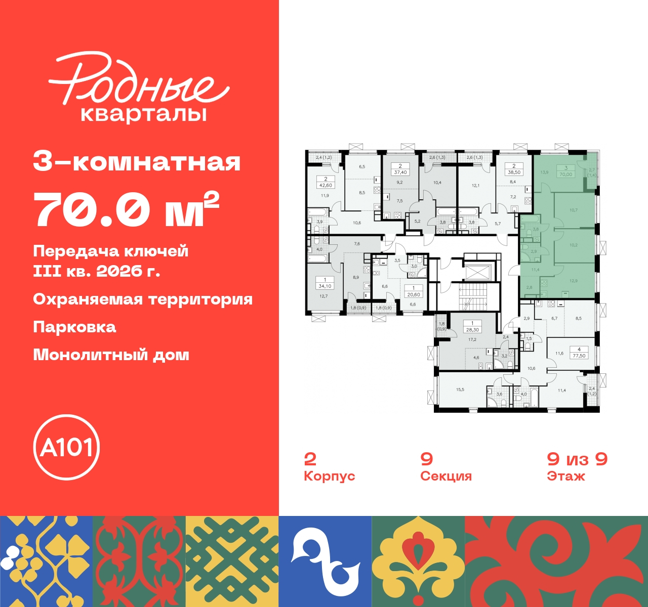 3-комн. квартира от застройщика в ЖК "Родные кварталы" на 9 этаже. Квартира без отделки, новый владелец может сделать ремонт по индивидуальному проекту. Общая площадь: 70 кв.м., жилая: 34.8 кв.м., площадь просторной кухни-столовой: 12.9 кв.м. Угловая квартира, идеально подойдет любителям тишины и панорамных видов. В квартире одна лоджия, два совмещенных санузла. Высота потолков 2.9 м. Имеется ниша под гардероб. Дом монолитный, многоподъездный, высотой 9 этажей. Квартира находится в 9-й секции в корпусе 2. На этаже 8 квартир. В подъезде 1 грузовой лифт. Начало строительства - 4 квартал 2023 года. Окончание строительства - 3 квартал 2026 года. Оформление сделки по договору долевого участия. Артикул квартиры по базе застройщика 96К-2-438. ПРЕДЛОЖЕНИЯ ОТ ЗАСТРОЙЩИКА В ОКТЯБРЕ 2025: Ипотека от 13,9 % для всех! На весь срок. "Семейная ипотека" вернулась. Ставка от 3,5 % на весь срок! Без удорожания! Выгодное ипотечное комбо: Ипотека от 2200 р./мес. и от 6 % после рождения ребёнка! Ипотека для всех "Держи пять!" - ставка 5 % на 2 года! *более подробную информацию по скидкам и акциям уточняйте в отделе продаж Новый жилой комплекс "Родные кварталы" строится в уютной, экологически благополучной локации на юго-западе столицы. В ближайшем окружении – ухоженные малоэтажные посёлки и живописный Ульяновский лесопарк. Благодаря этому из окон откроются вдохновляющие виды, которые не исчезнут со временем за фасадами многоэтажек. Через весь район пройдёт главный бульвар, который свяжет набережную, жилые кварталы и площади в единое дружелюбное пространство, органично наполненное узнаваемыми элементами культурных традиций разных народов. В жилом комплексе создаются условия для комфортного отдыха и занятий спортом всех жителей. Здесь можно прогуляться и отдохнуть в лесопарке на берегу ручья, позаниматься на тренажёрах под открытым небом и спортивных площадках. Для малышей построят игровые комплексы, развивающие силу, координацию и ловкость. Всего в жилом комплексе будет оборудовано 6 га территории для спокойного отдыха и около 9 га — для активного. Подъезды в домах освещены в любое время суток, входы и вестибюль хорошо просматриваются с улицы. Витражное остекление обеспечивает приток естественного света днём, а вечером зажигаются светильники. В отделке домов используется сочетание вентилируемого фасада с облицовкой из фибробетонной плитки и штукатуркой. Комфортная высота домов соразмерна человеку и в среднем составляет 10 этажей. Все дома обеспечены собственными подземными паркингами. В них размещаются машино-места и кладовые. В паркинг или кладовую можно спуститься на лифте или по лестнице. В комплексе появятся бытовые сервисы, магазины, аптеки и другие торгово-бытовые объекты. В жилом районе «Родные кварталы» будут построены: - образовательный центр: школа на 1300 учеников и детский сад на 250 малышей, - два детских сада на 200 мест каждый (один из них сдаётся в 1-й очереди). В транспортной доступности уже работают: - школа № 41 и детский сад — по Боровскому шоссе, - школа № 2057 и детский сад — на запад от района, в дер. Марушкино. ЖК «Родные кварталы» строится в Новомосковском округе столицы, в 15 минутах на автомобиле от аэропорта «Внуково». Район обеспечен удобными выездами на три крупные современные автотрассы. Здесь уже работает и активно развивается система наземного общественного транс