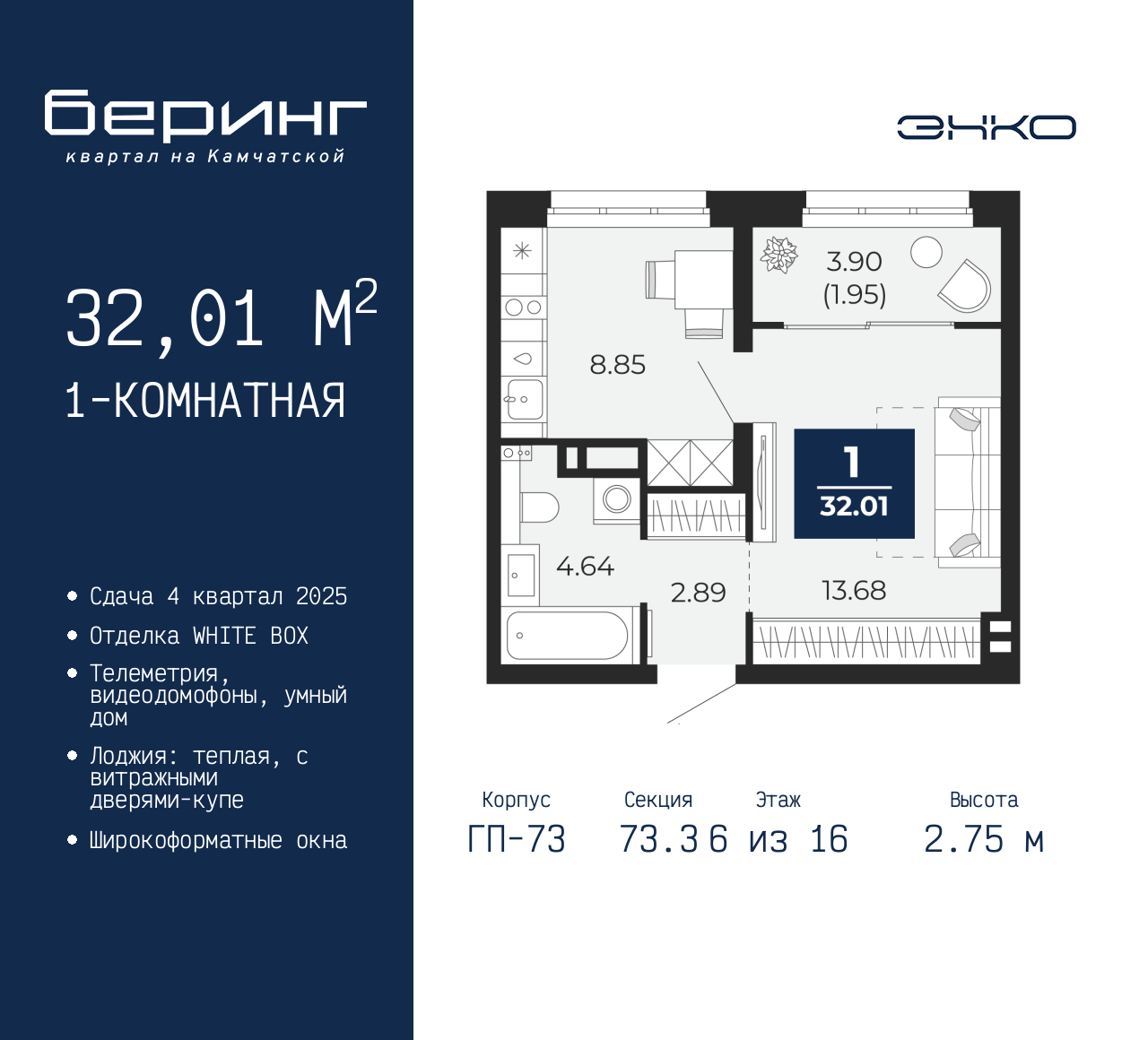 Просторная 1-комн. квартира в ЖК "Беринг" на 6 этаже. Квартира без отделки, полностью готова к чистовой отделке и дальнейшему ремонту. Общая площадь: 32.01 кв.м., жилая: 13.68 кв.м., площадь кухни: 8.85 кв.м. Все окна выходят на одну сторону. В квартире одна лоджия, один совмещенный санузел. Высота потолков 2.75 м. Дом монолитный, многоподъездный, переменной этажности, от 9 до 22 этажей. Квартира находится в 73.3-й секции высотой 16 этажей в корпусе ГП-73. На этаже 8 квартир. В подъезде 1 пассажирский и 1 грузовой лифт. Окончание строительства - 4 квартал 2025 года. Оформление сделки по договору долевого участия. Подобно знаменитому исследователю, мы чувствуем себя первооткрывателями этой локации. Хотим показать новую суть места, сформировать для вас жизненный опыт, которого ещё не было. Беринг — район зелёного цвета. Беринг — район, который откроется вам с другой стороны. Впечатлит новым уровнем комфорта и качеством жизни. Беринг — открытие на карте города. Первый квартал расположен в районе Тура, в границах улиц: Камчатская – Западносибирская – Энтузиастов. Вокруг уже есть всё для того, чтобы ежедневная рутина была лишь частью жизни и не доставляла дискомфорта. Школы и детские сады, магазины и аптеки, поликлиника, места для семейного отдыха, пеших и велопрогулок, и даже рыбалки. Масштабное озеленение дворов — визитная карточка ЭНКО и ваш оазис спокойствия, чтобы отвлечься от повседневности. Раскидистые деревья, кустарники, травы и цветы — осталось остановиться, вдохнуть и расслабиться, глядя на эту природную красоту. Стилистика подъездов продолжает концепцию Беринга, вдохновлённого Камчаткой: сдержанный, но при этом впечатляющий дизайн соседствует с удобством и функциональностью. (AQID02315476)