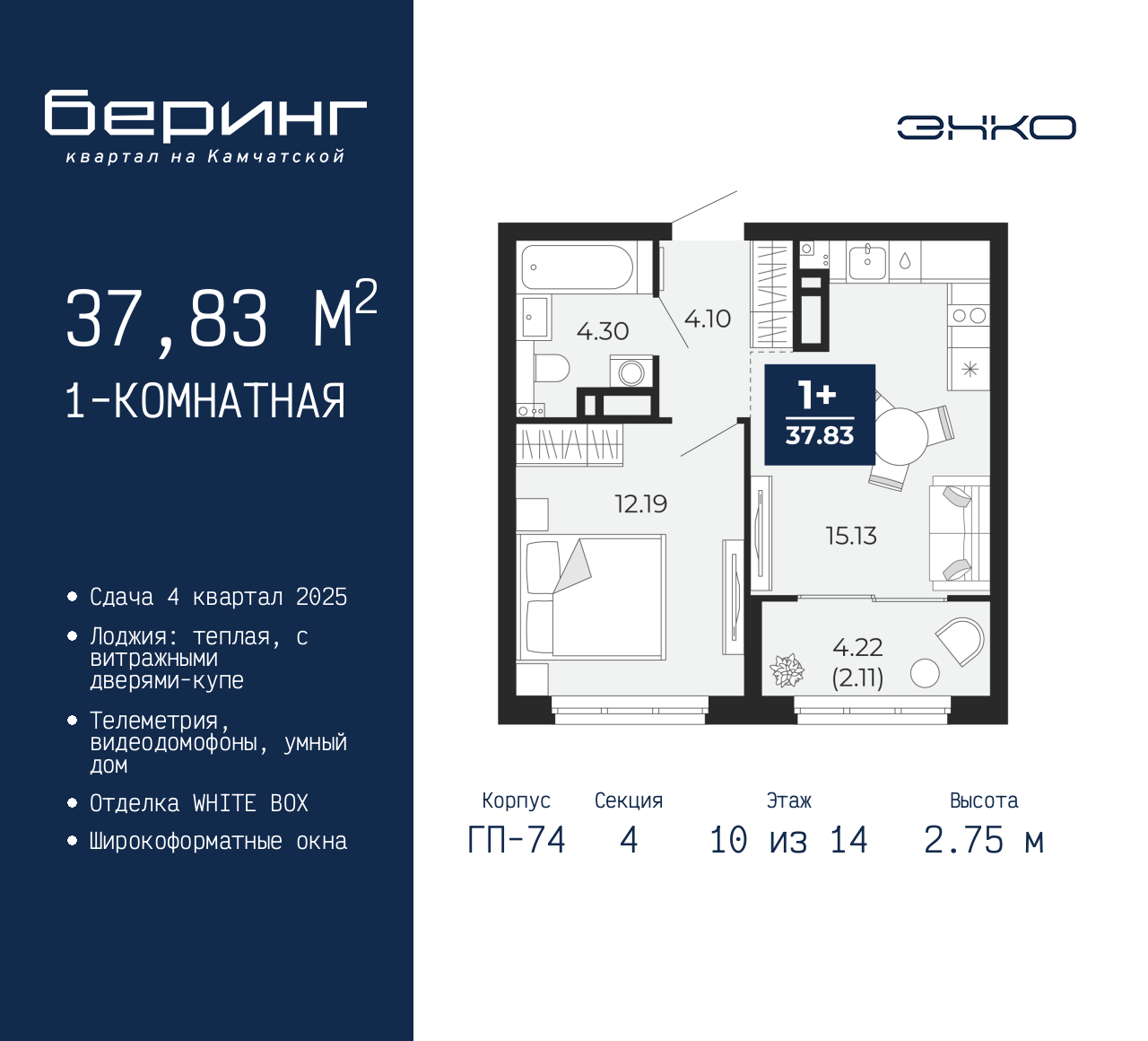 1-комн. квартира в ЖК "Беринг" на 10 этаже. Квартира без отделки, после выдачи ключей можно делать ремонт. Общая площадь: 37.83 кв.м., жилая: 12.19 кв.м., площадь просторной кухни-столовой: 15.13 кв.м. Все окна выходят на одну сторону. В квартире одна лоджия, один совмещенный санузел. Высота потолков 2.75 м. Дом монолитный, многоподъездный, переменной этажности, от 9 до 21 этажей. Квартира находится в 4-й секции высотой 14 этажей в корпусе ГП-74. На этаже 7 квартир. В подъезде 1 пассажирский и 1 грузовой лифт. Окончание строительства - 4 квартал 2025 года. Оформление сделки по договору долевого участия. Подобно знаменитому исследователю, мы чувствуем себя первооткрывателями этой локации. Хотим показать новую суть места, сформировать для вас жизненный опыт, которого ещё не было. Беринг — район зелёного цвета. Беринг — район, который откроется вам с другой стороны. Впечатлит новым уровнем комфорта и качеством жизни. Беринг — открытие на карте города. Первый квартал расположен в районе Тура, в границах улиц: Камчатская – Западносибирская – Энтузиастов. Вокруг уже есть всё для того, чтобы ежедневная рутина была лишь частью жизни и не доставляла дискомфорта. Школы и детские сады, магазины и аптеки, поликлиника, места для семейного отдыха, пеших и велопрогулок, и даже рыбалки. Масштабное озеленение дворов — визитная карточка ЭНКО и ваш оазис спокойствия, чтобы отвлечься от повседневности. Раскидистые деревья, кустарники, травы и цветы — осталось остановиться, вдохнуть и расслабиться, глядя на эту природную красоту. Стилистика подъездов продолжает концепцию Беринга, вдохновлённого Камчаткой: сдержанный, но при этом впечатляющий дизайн соседствует с удобством и функциональностью. (AQID02315672)