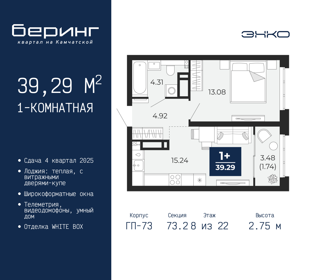 Продается однокомнатная квартира в ЖК "Беринг" на 8 этаже. Квартира без отделки, новый собственник может сделать ремонт по индивидуальному проекту. Общая площадь: 39.29 кв.м., жилая: 13.08 кв.м., площадь просторной кухни-столовой: 15.24 кв.м. Все окна выходят на одну сторону. В квартире одна лоджия, один совмещенный санузел. Высота потолков 2.75 м. Дом монолитный, многоподъездный, переменной этажности, от 9 до 22 этажей. Квартира находится в 73.2-й секции высотой 22 этажа в корпусе ГП-73. На этаже 7 квартир. В подъезде 1 пассажирский и 1 грузовой лифт. Окончание строительства - 4 квартал 2025 года. Оформление сделки по договору долевого участия. Подобно знаменитому исследователю, мы чувствуем себя первооткрывателями этой локации. Хотим показать новую суть места, сформировать для вас жизненный опыт, которого ещё не было. Беринг — район зелёного цвета. Беринг — район, который откроется вам с другой стороны. Впечатлит новым уровнем комфорта и качеством жизни. Беринг — открытие на карте города. Первый квартал расположен в районе Тура, в границах улиц: Камчатская – Западносибирская – Энтузиастов. Вокруг уже есть всё для того, чтобы ежедневная рутина была лишь частью жизни и не доставляла дискомфорта. Школы и детские сады, магазины и аптеки, поликлиника, места для семейного отдыха, пеших и велопрогулок, и даже рыбалки. Масштабное озеленение дворов — визитная карточка ЭНКО и ваш оазис спокойствия, чтобы отвлечься от повседневности. Раскидистые деревья, кустарники, травы и цветы — осталось остановиться, вдохнуть и расслабиться, глядя на эту природную красоту. Стилистика подъездов продолжает концепцию Беринга, вдохновлённого Камчаткой: сдержанный, но при этом впечатляющий дизайн соседствует с удобством и функциональностью. (AQID02315707)