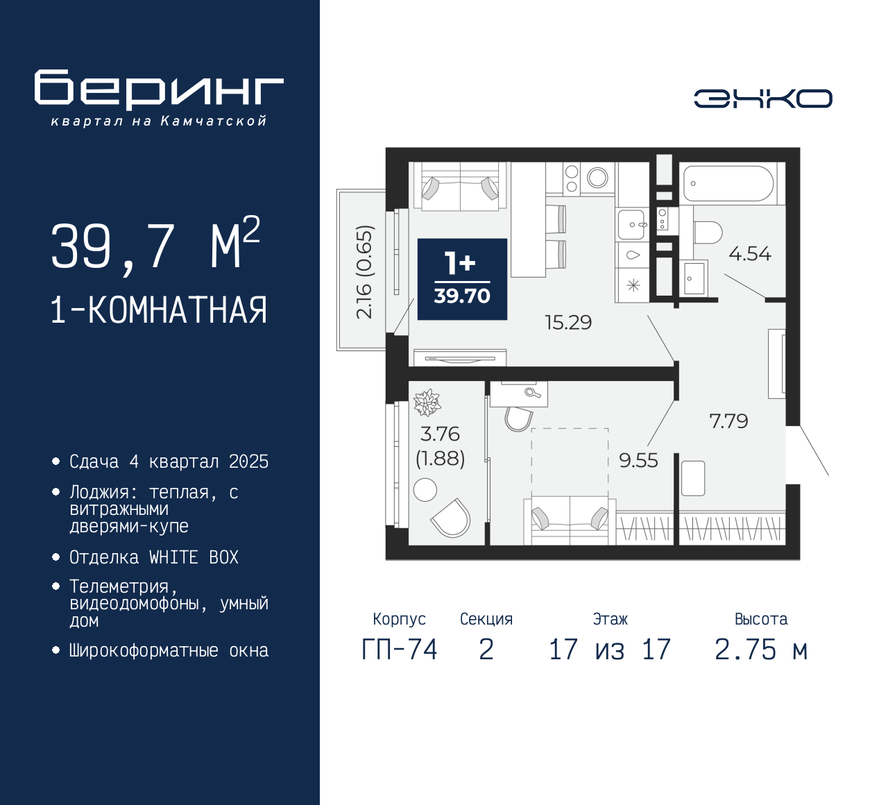 Продается однокомнатная квартира в ЖК "Беринг" на 17 этаже. Квартира без отделки, после выдачи ключей можно делать ремонт. Общая площадь: 39.7 кв.м., жилая: 9.55 кв.м., площадь просторной кухни-столовой: 15.29 кв.м. Все окна выходят на одну сторону. В квартире один балкон и одна лоджия, один совмещенный санузел. Высота потолков 2.75 м. Дом монолитный, многоподъездный, переменной этажности, от 9 до 21 этажей. Квартира находится во 2-й секции высотой 17 этажей в корпусе ГП-74. На этаже 7 квартир. В подъезде 1 пассажирский и 1 грузовой лифт. Окончание строительства - 4 квартал 2025 года. Оформление сделки по договору долевого участия. Подобно знаменитому исследователю, мы чувствуем себя первооткрывателями этой локации. Хотим показать новую суть места, сформировать для вас жизненный опыт, которого ещё не было. Беринг — район зелёного цвета. Беринг — район, который откроется вам с другой стороны. Впечатлит новым уровнем комфорта и качеством жизни. Беринг — открытие на карте города. Первый квартал расположен в районе Тура, в границах улиц: Камчатская – Западносибирская – Энтузиастов. Вокруг уже есть всё для того, чтобы ежедневная рутина была лишь частью жизни и не доставляла дискомфорта. Школы и детские сады, магазины и аптеки, поликлиника, места для семейного отдыха, пеших и велопрогулок, и даже рыбалки. Масштабное озеленение дворов — визитная карточка ЭНКО и ваш оазис спокойствия, чтобы отвлечься от повседневности. Раскидистые деревья, кустарники, травы и цветы — осталось остановиться, вдохнуть и расслабиться, глядя на эту природную красоту. Стилистика подъездов продолжает концепцию Беринга, вдохновлённого Камчаткой: сдержанный, но при этом впечатляющий дизайн соседствует с удобством и функциональностью. (AQID02315826)