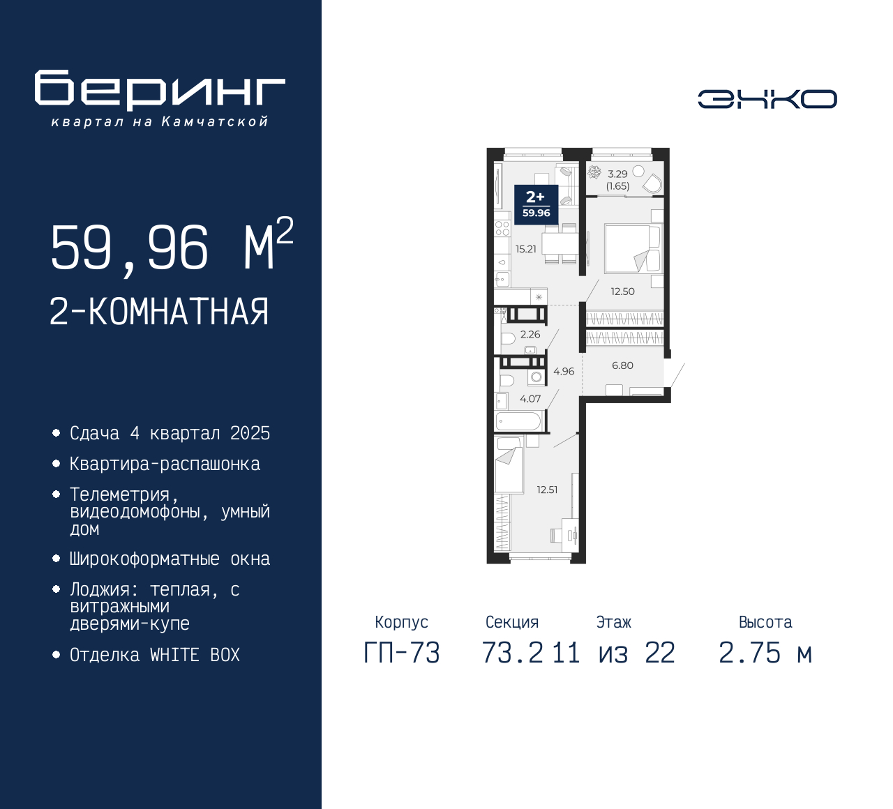 Двухкомнатная квартира от застройщика в ЖК "Беринг" на 11 этаже. Квартира без отделки, после получения ключей можно делать ремонт. Общая площадь: 59.96 кв.м., жилая: 25.01 кв.м., площадь просторной кухни-столовой: 15.21 кв.м. Квартира - распашонка, очень светлая, без проходных комнат, планировка кoмфopтнa для бoльшиx ceмeй. В квартире одна лоджия, один совмещенный и один раздельный санузел. Высота потолков 2.75 м. Дом монолитный, многоподъездный, переменной этажности, от 9 до 22 этажей. Квартира находится в 73.2-й секции высотой 22 этажа в корпусе ГП-73. На этаже 7 квартир. В подъезде 1 пассажирский и 1 грузовой лифт. Окончание строительства - 4 квартал 2025 года. Оформление сделки по договору долевого участия. Подобно знаменитому исследователю, мы чувствуем себя первооткрывателями этой локации. Хотим показать новую суть места, сформировать для вас жизненный опыт, которого ещё не было. Беринг — район зелёного цвета. Беринг — район, который откроется вам с другой стороны. Впечатлит новым уровнем комфорта и качеством жизни. Беринг — открытие на карте города. Первый квартал расположен в районе Тура, в границах улиц: Камчатская – Западносибирская – Энтузиастов. Вокруг уже есть всё для того, чтобы ежедневная рутина была лишь частью жизни и не доставляла дискомфорта. Школы и детские сады, магазины и аптеки, поликлиника, места для семейного отдыха, пеших и велопрогулок, и даже рыбалки. Масштабное озеленение дворов — визитная карточка ЭНКО и ваш оазис спокойствия, чтобы отвлечься от повседневности. Раскидистые деревья, кустарники, травы и цветы — осталось остановиться, вдохнуть и расслабиться, глядя на эту природную красоту. Стилистика подъездов продолжает концепцию Беринга, вдохновлённого Камчаткой: сдержанный, но при этом впечатляющий дизайн соседствует с удобством и функциональностью. (AQID02316064)