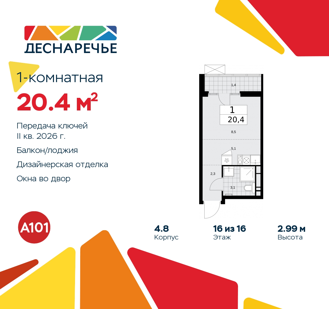 Продается 1-комн. квартира-студия с отделкой в ЖК "Деснаречье" на 16 этаже. Общая площадь: 20.4 кв.м., площадь гостиной 13.6 кв.м., из которых 5.1 кв.м. выделено под кухонную зону. Все окна выходят на одну сторону. В квартире один балкон, один совмещенный санузел. Высота потолков 2.99 м. Эта квартира будет сдана с дизайнеркой отделкой "под ключ". Специально для вас мы разработали несколько решений дизайнерской отделки. В отделке используются только современный высококлассные материалы, на все работы предоставляется гарантия. В таком случае вы оплачиваете отделку в сегодняшних ценах, а эту стоимость вы можете разнести в ипотечных платежах. Дом монолитный, многоподъездный, переменной этажности, от 7 до 16 этажей. Квартира находится в 1-й секции высотой 16 этажей в корпусе 4.8. На этаже 6 квартир. В подъезде 1 пассажирский и 1 грузовой лифт. Начало строительства - 3 квартал 2023 года. Окончание строительства - 2 квартал 2026 года. Оформление сделки по договору долевого участия. Артикул квартиры по базе застройщика 88К-4.8-1782. ПРЕДЛОЖЕНИЯ ОТ ЗАСТРОЙЩИКА В ОКТЯБРЕ 2025: Ипотека от 13,9 % для всех! На весь срок. "Семейная ипотека" вернулась. Ставка от 3,5 % на весь срок! Без удорожания! Выгодное ипотечное комбо: Ипотека от 2200 р./мес. и от 6 % после рождения ребёнка! Ипотека для всех "Держи пять!" - ставка 5 % на 2 года! *более подробную информацию по скидкам и акциям уточняйте в отделе продаж Масштабный проект "Деснаречье" на юго-западе Москвы, который включает три новых района («квартала»), объединённые общей идеей – воплотить в реальность мечты современных жителей столицы об интересном, комфортном и разноплановом городском пространстве в окружении рек и лесов, словно сошедших с полотен русских живописцев: - «Берег» оценят все, кому близка водная стихия: плеск волн, солнечные блики и прогулки вдоль тихого течения речи. - «Лес» утопает в зелени парков и лесов. Здесь соблюдён идеальный баланс загородного спокойствия и столичного комфорта. - «Парк», самый энергичный и яркий, отличается высокой концентрацией пространств для спорта и творчества. Жилой комплекс "Деснаречье" расположится в 12 км от МКАД по современному Калужскому шоссе. Внешний облик зданий соответствует современному стилю и стандартам, характерным и для других популярных проектов ГК «А101»: сочетание контрастных тонов, большое количество остекления, в котором отражается небо, гармония с природным окружением. Весь город - в вашем районе. Находиться на территории «15-минутного города» значит иметь всё необходимое для полноценной жизни в шаговой доступности. Маршруты в районе «Деснаречье» выстроены так, чтобы добраться до магазинов, парков, школ, салонов услуг и других объектов можно было всего за несколько минут пешком или на велосипеде. Двор закрытый от машин – это тишина, комфорт и безопасность, поэтому все машино-места (включая «семейные» и увеличенные, с возможностью установки роллетных шкафов) находятся в подземном паркинге. В паркинги можно спуститься на лифте из любого подъезда или по лестнице. Рядом с «Деснаречьем» в 2027 году планируется открытие станции метро «Десна», до которой будет удобно добраться пешком или на велосипеде. Дорога на автомобиле до перехватывающих парковок станций «Ольховая» и «Прокшино» займёт около 10 минут. В процессе реализации проекта будут появляться новые маршруты общественного тран