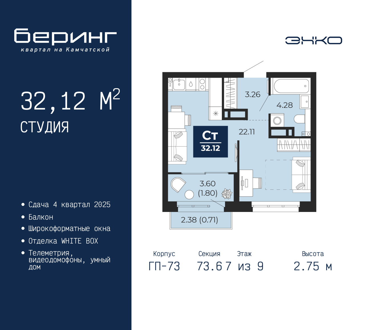 1-комн. квартира-студия от застройщика в ЖК "Беринг" на 7 этаже. Квартира без отделки, после оформления собственности можно делать ремонт. Общая площадь: 32.12 кв.м., площадь гостиной 22.11 кв.м., из которых 5 кв.м. выделено под кухонную зону. Все окна выходят на одну сторону. В квартире один балкон, один совмещенный санузел. Высота потолков 2.75 м. Дом монолитный, многоподъездный, переменной этажности, от 9 до 22 этажей. Квартира находится в 73.6-й секции высотой 9 этажей в корпусе ГП-73. На этаже 5 квартир. В подъезде 1 пассажирский и 1 грузовой лифт. Окончание строительства - 4 квартал 2025 года. Оформление сделки по договору долевого участия. Подобно знаменитому исследователю, мы чувствуем себя первооткрывателями этой локации. Хотим показать новую суть места, сформировать для вас жизненный опыт, которого ещё не было. Беринг — район зелёного цвета. Беринг — район, который откроется вам с другой стороны. Впечатлит новым уровнем комфорта и качеством жизни. Беринг — открытие на карте города. Первый квартал расположен в районе Тура, в границах улиц: Камчатская – Западносибирская – Энтузиастов. Вокруг уже есть всё для того, чтобы ежедневная рутина была лишь частью жизни и не доставляла дискомфорта. Школы и детские сады, магазины и аптеки, поликлиника, места для семейного отдыха, пеших и велопрогулок, и даже рыбалки. Масштабное озеленение дворов — визитная карточка ЭНКО и ваш оазис спокойствия, чтобы отвлечься от повседневности. Раскидистые деревья, кустарники, травы и цветы — осталось остановиться, вдохнуть и расслабиться, глядя на эту природную красоту. Стилистика подъездов продолжает концепцию Беринга, вдохновлённого Камчаткой: сдержанный, но при этом впечатляющий дизайн соседствует с удобством и функциональностью. (AQID02315540)