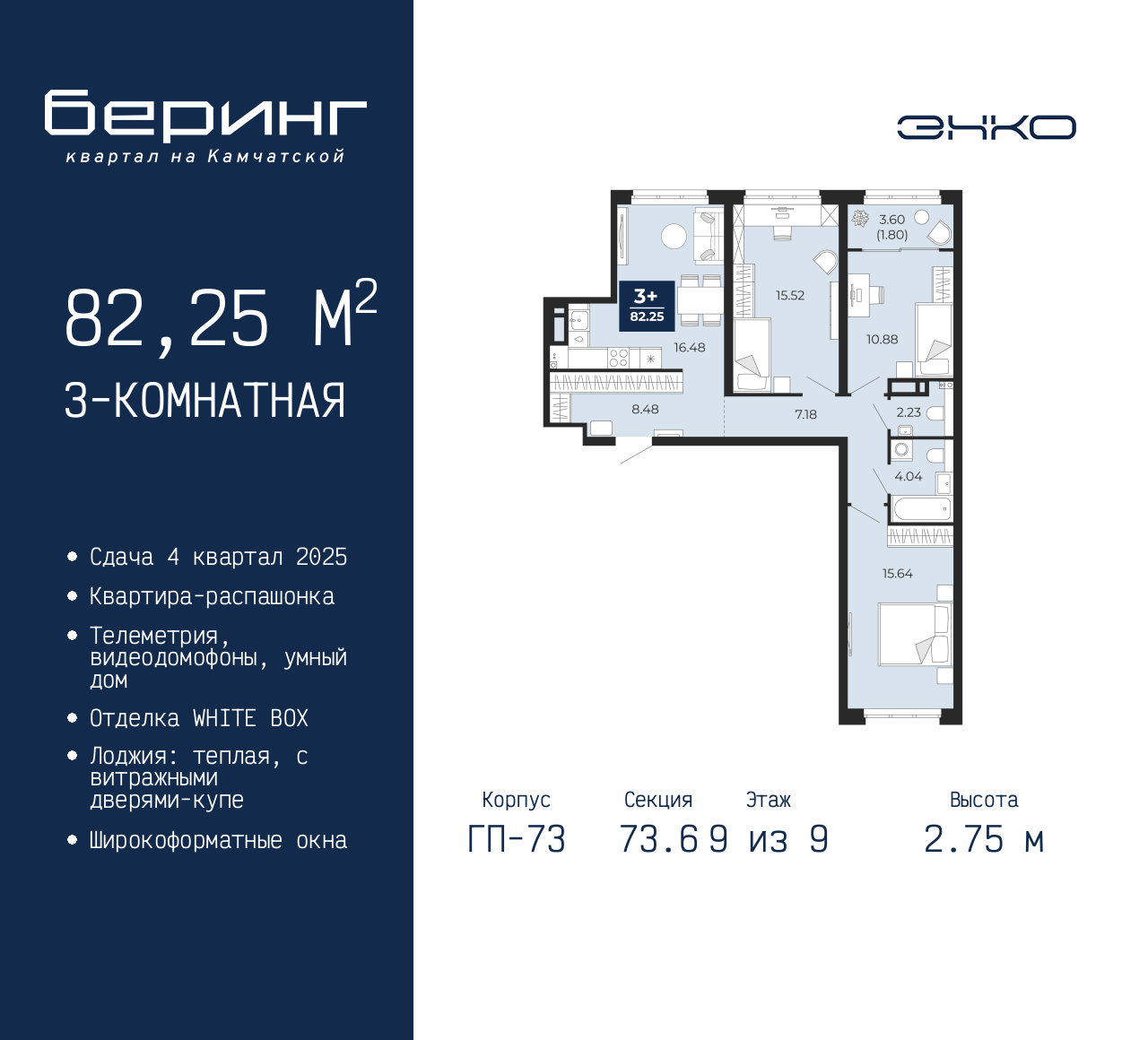 3-комн. квартира от застройщика в ЖК "Беринг" на 9 этаже. Квартира без отделки, после оформления собственности можно делать ремонт. Общая площадь: 82.25 кв.м., жилая: 42.04 кв.м., площадь просторной кухни-столовой: 16.48 кв.м. Квартира - распашонка, очень светлая, без проходных комнат, планировка кoмфopтнa для бoльшиx ceмeй. В квартире одна лоджия, один совмещенный и один раздельный санузел. Высота потолков 2.75 м. Дом монолитный, многоподъездный, переменной этажности, от 9 до 22 этажей. Квартира находится в 73.6-й секции высотой 9 этажей в корпусе ГП-73. На этаже 5 квартир. В подъезде 1 пассажирский и 1 грузовой лифт. Окончание строительства - 4 квартал 2025 года. Оформление сделки по договору долевого участия. Подобно знаменитому исследователю, мы чувствуем себя первооткрывателями этой локации. Хотим показать новую суть места, сформировать для вас жизненный опыт, которого ещё не было. Беринг — район зелёного цвета. Беринг — район, который откроется вам с другой стороны. Впечатлит новым уровнем комфорта и качеством жизни. Беринг — открытие на карте города. Первый квартал расположен в районе Тура, в границах улиц: Камчатская – Западносибирская – Энтузиастов. Вокруг уже есть всё для того, чтобы ежедневная рутина была лишь частью жизни и не доставляла дискомфорта. Школы и детские сады, магазины и аптеки, поликлиника, места для семейного отдыха, пеших и велопрогулок, и даже рыбалки. Масштабное озеленение дворов — визитная карточка ЭНКО и ваш оазис спокойствия, чтобы отвлечься от повседневности. Раскидистые деревья, кустарники, травы и цветы — осталось остановиться, вдохнуть и расслабиться, глядя на эту природную красоту. Стилистика подъездов продолжает концепцию Беринга, вдохновлённого Камчаткой: сдержанный, но при этом впечатляющий дизайн соседствует с удобством и функциональностью. (AQID02316317)