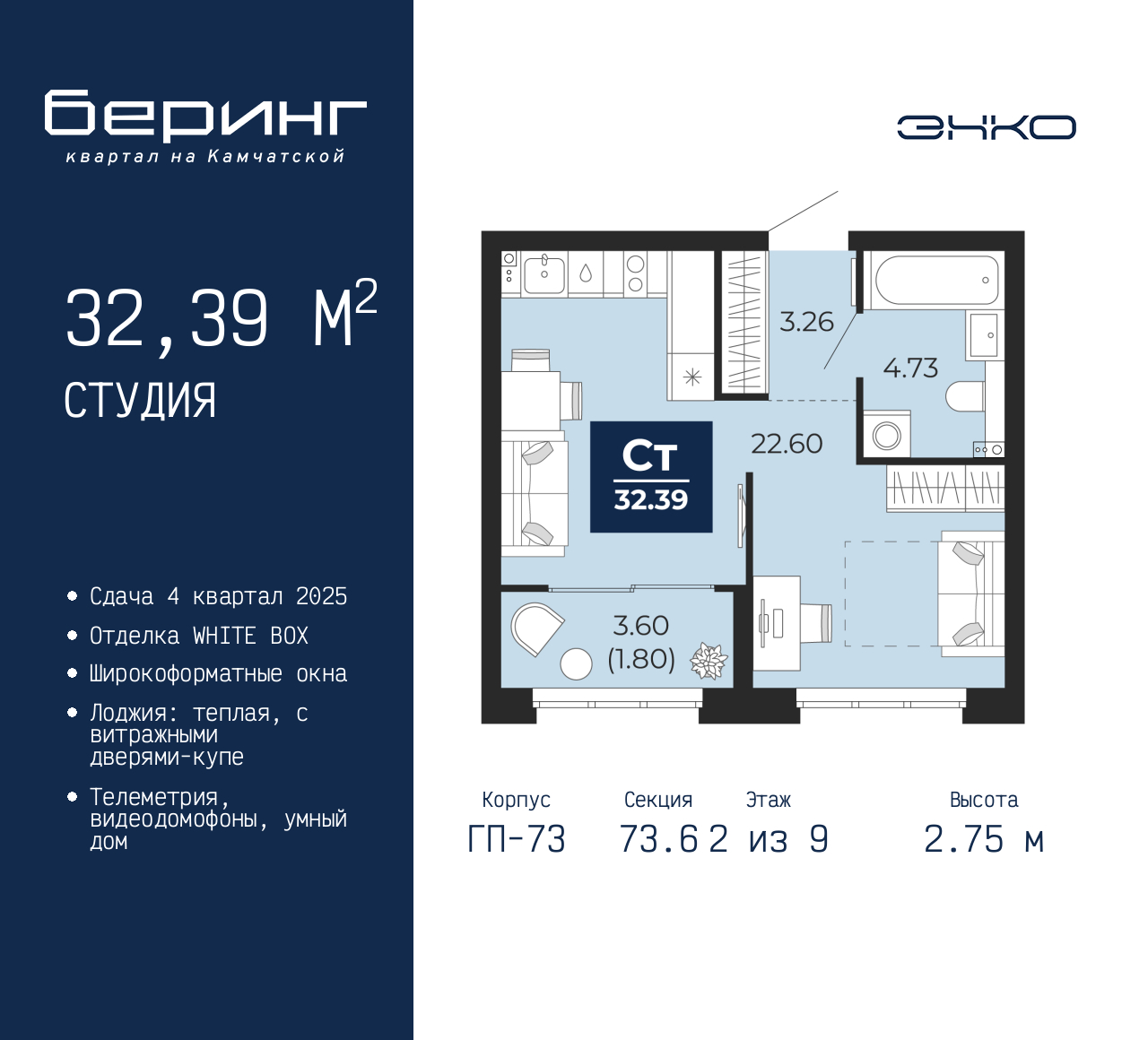 Просторная 1-комн. квартира-студия в ЖК "Беринг" на 2 этаже. Квартира без отделки, полностью готова к чистовой отделке и дальнейшему ремонту. Общая площадь: 32.39 кв.м., площадь гостиной 22.6 кв.м., из которых 5 кв.м. выделено под кухонную зону. Все окна выходят на одну сторону. В квартире одна лоджия, один совмещенный санузел. Высота потолков 2.75 м. Дом монолитный, многоподъездный, переменной этажности, от 9 до 22 этажей. Квартира находится в 73.6-й секции высотой 9 этажей в корпусе ГП-73. На этаже 5 квартир. В подъезде 1 пассажирский и 1 грузовой лифт. Окончание строительства - 4 квартал 2025 года. Оформление сделки по договору долевого участия. Подобно знаменитому исследователю, мы чувствуем себя первооткрывателями этой локации. Хотим показать новую суть места, сформировать для вас жизненный опыт, которого ещё не было. Беринг — район зелёного цвета. Беринг — район, который откроется вам с другой стороны. Впечатлит новым уровнем комфорта и качеством жизни. Беринг — открытие на карте города. Первый квартал расположен в районе Тура, в границах улиц: Камчатская – Западносибирская – Энтузиастов. Вокруг уже есть всё для того, чтобы ежедневная рутина была лишь частью жизни и не доставляла дискомфорта. Школы и детские сады, магазины и аптеки, поликлиника, места для семейного отдыха, пеших и велопрогулок, и даже рыбалки. Масштабное озеленение дворов — визитная карточка ЭНКО и ваш оазис спокойствия, чтобы отвлечься от повседневности. Раскидистые деревья, кустарники, травы и цветы — осталось остановиться, вдохнуть и расслабиться, глядя на эту природную красоту. Стилистика подъездов продолжает концепцию Беринга, вдохновлённого Камчаткой: сдержанный, но при этом впечатляющий дизайн соседствует с удобством и функциональностью. (AQID02315513)