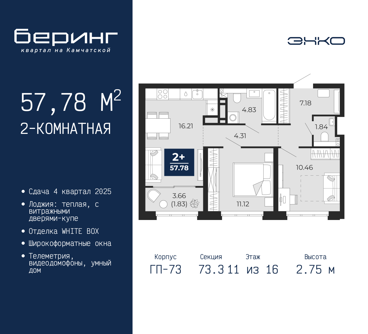 Двухкомнатная квартира в ЖК "Беринг" на 11 этаже. Квартира без отделки, после получения ключей можно делать ремонт. Общая площадь: 57.78 кв.м., жилая: 21.58 кв.м., площадь просторной кухни-столовой: 16.23 кв.м. Комнаты изолированные, все окна выходят на одну сторону. В квартире одна лоджия, один совмещенный и один раздельный санузел. Высота потолков 2.75 м. Дом монолитный, многоподъездный, переменной этажности, от 9 до 22 этажей. Квартира находится в 73.3-й секции высотой 16 этажей в корпусе ГП-73. На этаже 8 квартир. В подъезде 1 пассажирский и 1 грузовой лифт. Окончание строительства - 4 квартал 2025 года. Оформление сделки по договору долевого участия. Подобно знаменитому исследователю, мы чувствуем себя первооткрывателями этой локации. Хотим показать новую суть места, сформировать для вас жизненный опыт, которого ещё не было. Беринг — район зелёного цвета. Беринг — район, который откроется вам с другой стороны. Впечатлит новым уровнем комфорта и качеством жизни. Беринг — открытие на карте города. Первый квартал расположен в районе Тура, в границах улиц: Камчатская – Западносибирская – Энтузиастов. Вокруг уже есть всё для того, чтобы ежедневная рутина была лишь частью жизни и не доставляла дискомфорта. Школы и детские сады, магазины и аптеки, поликлиника, места для семейного отдыха, пеших и велопрогулок, и даже рыбалки. Масштабное озеленение дворов — визитная карточка ЭНКО и ваш оазис спокойствия, чтобы отвлечься от повседневности. Раскидистые деревья, кустарники, травы и цветы — осталось остановиться, вдохнуть и расслабиться, глядя на эту природную красоту. Стилистика подъездов продолжает концепцию Беринга, вдохновлённого Камчаткой: сдержанный, но при этом впечатляющий дизайн соседствует с удобством и функциональностью. (AQID02315989)