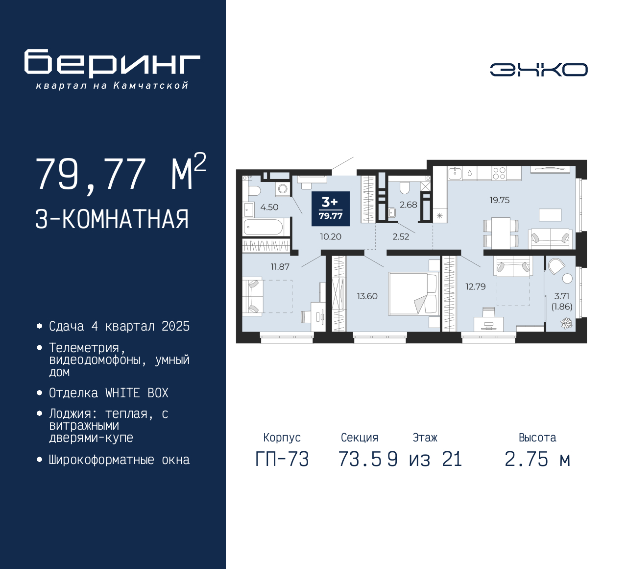 Просторная трехкомнатная квартира в ЖК "Беринг" на 9 этаже. Квартира без отделки, после оформления собственности можно делать ремонт. Общая площадь: 79.77 кв.м., жилая: 38.26 кв.м., площадь просторной кухни-столовой: 19.75 кв.м. Угловая квартира, окна oбecпeчивaют paвнoмepнoe ocвeщeниe в тeчeниe дня. В квартире одна лоджия, один совмещенный и один раздельный санузел. Высота потолков 2.75 м. Дом монолитный, многоподъездный, переменной этажности, от 9 до 22 этажей. Квартира находится в 73.5-й секции высотой 21 этаж в корпусе ГП-73. На этаже 6 квартир. В подъезде 1 пассажирский и 1 грузовой лифт. Окончание строительства - 4 квартал 2025 года. Оформление сделки по договору долевого участия. Подобно знаменитому исследователю, мы чувствуем себя первооткрывателями этой локации. Хотим показать новую суть места, сформировать для вас жизненный опыт, которого ещё не было. Беринг — район зелёного цвета. Беринг — район, который откроется вам с другой стороны. Впечатлит новым уровнем комфорта и качеством жизни. Беринг — открытие на карте города. Первый квартал расположен в районе Тура, в границах улиц: Камчатская – Западносибирская – Энтузиастов. Вокруг уже есть всё для того, чтобы ежедневная рутина была лишь частью жизни и не доставляла дискомфорта. Школы и детские сады, магазины и аптеки, поликлиника, места для семейного отдыха, пеших и велопрогулок, и даже рыбалки. Масштабное озеленение дворов — визитная карточка ЭНКО и ваш оазис спокойствия, чтобы отвлечься от повседневности. Раскидистые деревья, кустарники, травы и цветы — осталось остановиться, вдохнуть и расслабиться, глядя на эту природную красоту. Стилистика подъездов продолжает концепцию Беринга, вдохновлённого Камчаткой: сдержанный, но при этом впечатляющий дизайн соседствует с удобством и функциональностью. (AQID02439042)