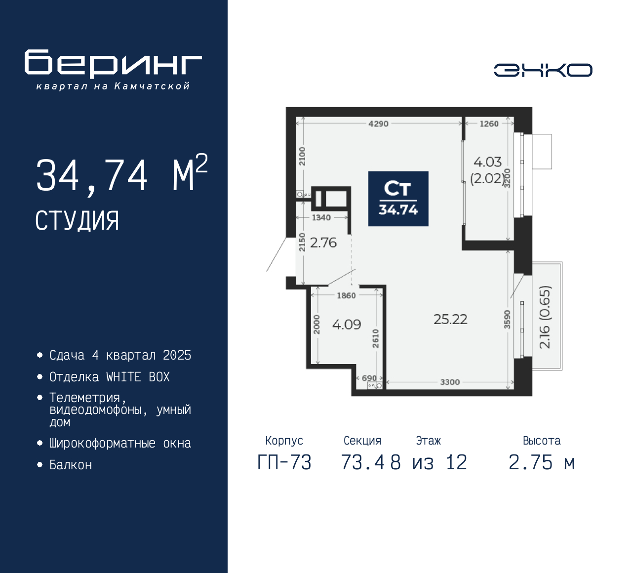 1-комн. квартира-студия от застройщика в ЖК "Беринг" на 8 этаже. Квартира без отделки, полностью готова к ремонту. Общая площадь: 34.74 кв.м., площадь гостиной 25.22 кв.м., из которых 5 кв.м. выделено под кухонную зону. Все окна выходят на одну сторону. В квартире один балкон, один совмещенный санузел. Высота потолков 2.75 м. Дом монолитный, многоподъездный, переменной этажности, от 9 до 22 этажей. Квартира находится в 73.4-й секции высотой 12 этажей в корпусе ГП-73. На этаже 8 квартир. В подъезде 1 пассажирский и 1 грузовой лифт. Окончание строительства - 4 квартал 2025 года. Оформление сделки по договору долевого участия. Подобно знаменитому исследователю, мы чувствуем себя первооткрывателями этой локации. Хотим показать новую суть места, сформировать для вас жизненный опыт, которого ещё не было. Беринг — район зелёного цвета. Беринг — район, который откроется вам с другой стороны. Впечатлит новым уровнем комфорта и качеством жизни. Беринг — открытие на карте города. Первый квартал расположен в районе Тура, в границах улиц: Камчатская – Западносибирская – Энтузиастов. Вокруг уже есть всё для того, чтобы ежедневная рутина была лишь частью жизни и не доставляла дискомфорта. Школы и детские сады, магазины и аптеки, поликлиника, места для семейного отдыха, пеших и велопрогулок, и даже рыбалки. Масштабное озеленение дворов — визитная карточка ЭНКО и ваш оазис спокойствия, чтобы отвлечься от повседневности. Раскидистые деревья, кустарники, травы и цветы — осталось остановиться, вдохнуть и расслабиться, глядя на эту природную красоту. Стилистика подъездов продолжает концепцию Беринга, вдохновлённого Камчаткой: сдержанный, но при этом впечатляющий дизайн соседствует с удобством и функциональностью. (AQID02315528)