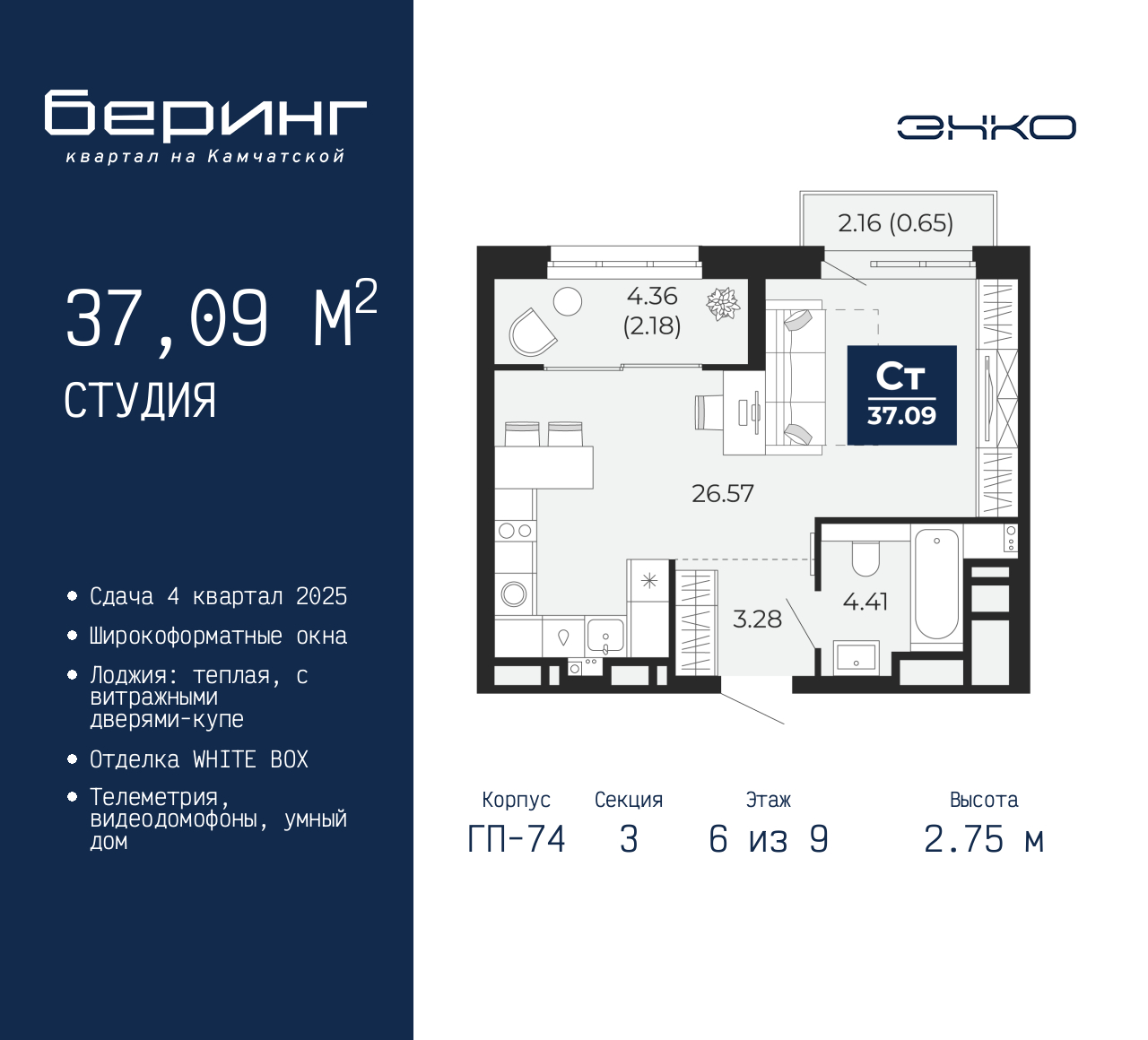 Однокомнатная квартира-студия в ЖК "Беринг" на 6 этаже. Квартира без отделки, после оформления собственности можно делать ремонт. Общая площадь: 37.09 кв.м., площадь гостиной 26.57 кв.м., из которых 5 кв.м. выделено под кухонную зону. Все окна выходят на одну сторону. В квартире один балкон и одна лоджия, один совмещенный санузел. Высота потолков 2.75 м. Дом монолитный, многоподъездный, переменной этажности, от 9 до 21 этажей. Квартира находится в 3-й секции высотой 9 этажей в корпусе ГП-74. На этаже 7 квартир. В подъезде 1 грузовой лифт. Окончание строительства - 4 квартал 2025 года. Оформление сделки по договору долевого участия. Подобно знаменитому исследователю, мы чувствуем себя первооткрывателями этой локации. Хотим показать новую суть места, сформировать для вас жизненный опыт, которого ещё не было. Беринг — район зелёного цвета. Беринг — район, который откроется вам с другой стороны. Впечатлит новым уровнем комфорта и качеством жизни. Беринг — открытие на карте города. Первый квартал расположен в районе Тура, в границах улиц: Камчатская – Западносибирская – Энтузиастов. Вокруг уже есть всё для того, чтобы ежедневная рутина была лишь частью жизни и не доставляла дискомфорта. Школы и детские сады, магазины и аптеки, поликлиника, места для семейного отдыха, пеших и велопрогулок, и даже рыбалки. Масштабное озеленение дворов — визитная карточка ЭНКО и ваш оазис спокойствия, чтобы отвлечься от повседневности. Раскидистые деревья, кустарники, травы и цветы — осталось остановиться, вдохнуть и расслабиться, глядя на эту природную красоту. Стилистика подъездов продолжает концепцию Беринга, вдохновлённого Камчаткой: сдержанный, но при этом впечатляющий дизайн соседствует с удобством и функциональностью. (AQID02315717)