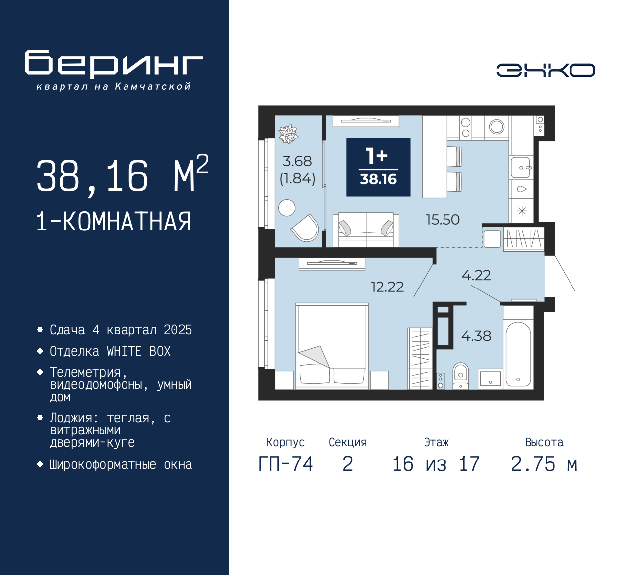 1-комн. квартира в ЖК "Беринг" на 16 этаже. Квартира без отделки, после получения ключей можно делать ремонт. Общая площадь: 38.16 кв.м., жилая: 12.22 кв.м., площадь просторной кухни-столовой: 15.5 кв.м. Все окна выходят на одну сторону. В квартире одна лоджия, один совмещенный санузел. Высота потолков 2.75 м. Дом монолитный, многоподъездный, переменной этажности, от 9 до 21 этажей. Квартира находится во 2-й секции высотой 17 этажей в корпусе ГП-74. На этаже 7 квартир. В подъезде 1 пассажирский и 1 грузовой лифт. Окончание строительства - 4 квартал 2025 года. Оформление сделки по договору долевого участия. Подобно знаменитому исследователю, мы чувствуем себя первооткрывателями этой локации. Хотим показать новую суть места, сформировать для вас жизненный опыт, которого ещё не было. Беринг — район зелёного цвета. Беринг — район, который откроется вам с другой стороны. Впечатлит новым уровнем комфорта и качеством жизни. Беринг — открытие на карте города. Первый квартал расположен в районе Тура, в границах улиц: Камчатская – Западносибирская – Энтузиастов. Вокруг уже есть всё для того, чтобы ежедневная рутина была лишь частью жизни и не доставляла дискомфорта. Школы и детские сады, магазины и аптеки, поликлиника, места для семейного отдыха, пеших и велопрогулок, и даже рыбалки. Масштабное озеленение дворов — визитная карточка ЭНКО и ваш оазис спокойствия, чтобы отвлечься от повседневности. Раскидистые деревья, кустарники, травы и цветы — осталось остановиться, вдохнуть и расслабиться, глядя на эту природную красоту. Стилистика подъездов продолжает концепцию Беринга, вдохновлённого Камчаткой: сдержанный, но при этом впечатляющий дизайн соседствует с удобством и функциональностью. (AQID02315647)