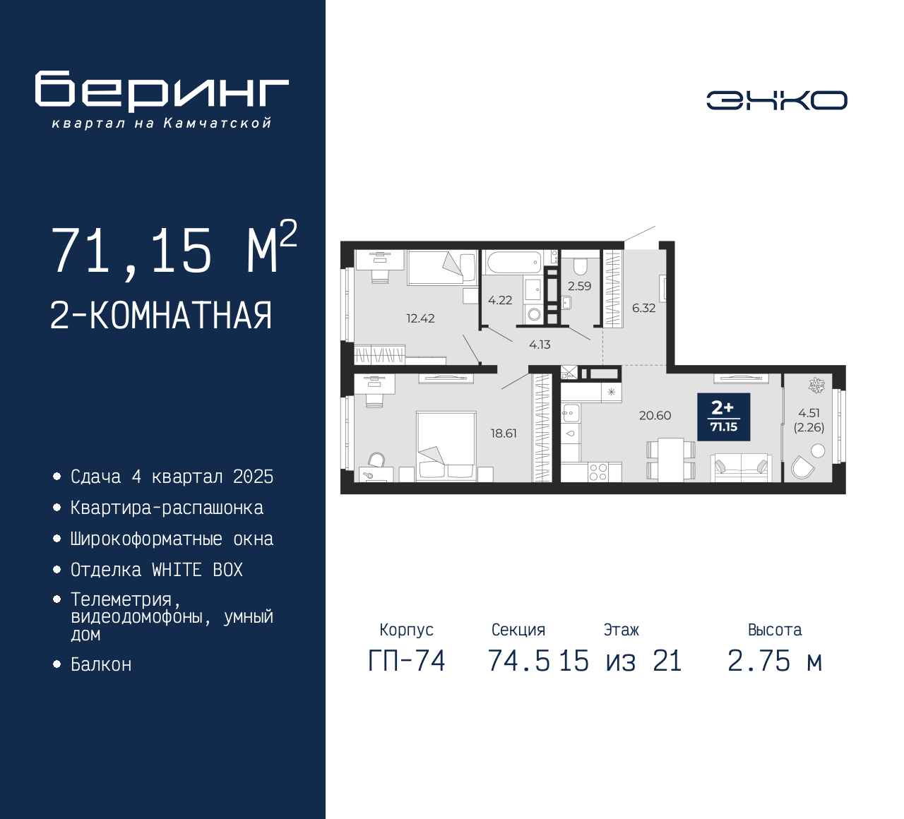 Просторная двухкомнатная квартира в ЖК "Беринг" на 15 этаже. Квартира без отделки, полностью готова к чистовой отделке и дальнейшему ремонту. Общая площадь: 71.15 кв.м., жилая: 31.03 кв.м., площадь просторной кухни-столовой: 20.6 кв.м. Квартира - распашонка, без проходных комнат, окна выходят на paзные стороны дома. В квартире один балкон, один раздельный санузел. Высота потолков 2.75 м. Дом монолитный, многоподъездный, переменной этажности, от 9 до 21 этажей. Квартира находится в 74.5-й секции высотой 21 этаж в корпусе ГП-74. На этаже 7 квартир. В подъезде 1 пассажирский и 1 грузовой лифт. Окончание строительства - 4 квартал 2025 года. Оформление сделки по договору долевого участия. Подобно знаменитому исследователю, мы чувствуем себя первооткрывателями этой локации. Хотим показать новую суть места, сформировать для вас жизненный опыт, которого ещё не было. Беринг — район зелёного цвета. Беринг — район, который откроется вам с другой стороны. Впечатлит новым уровнем комфорта и качеством жизни. Беринг — открытие на карте города. Первый квартал расположен в районе Тура, в границах улиц: Камчатская – Западносибирская – Энтузиастов. Вокруг уже есть всё для того, чтобы ежедневная рутина была лишь частью жизни и не доставляла дискомфорта. Школы и детские сады, магазины и аптеки, поликлиника, места для семейного отдыха, пеших и велопрогулок, и даже рыбалки. Масштабное озеленение дворов — визитная карточка ЭНКО и ваш оазис спокойствия, чтобы отвлечься от повседневности. Раскидистые деревья, кустарники, травы и цветы — осталось остановиться, вдохнуть и расслабиться, глядя на эту природную красоту. Стилистика подъездов продолжает концепцию Беринга, вдохновлённого Камчаткой: сдержанный, но при этом впечатляющий дизайн соседствует с удобством и функциональностью. (AQID02316193)