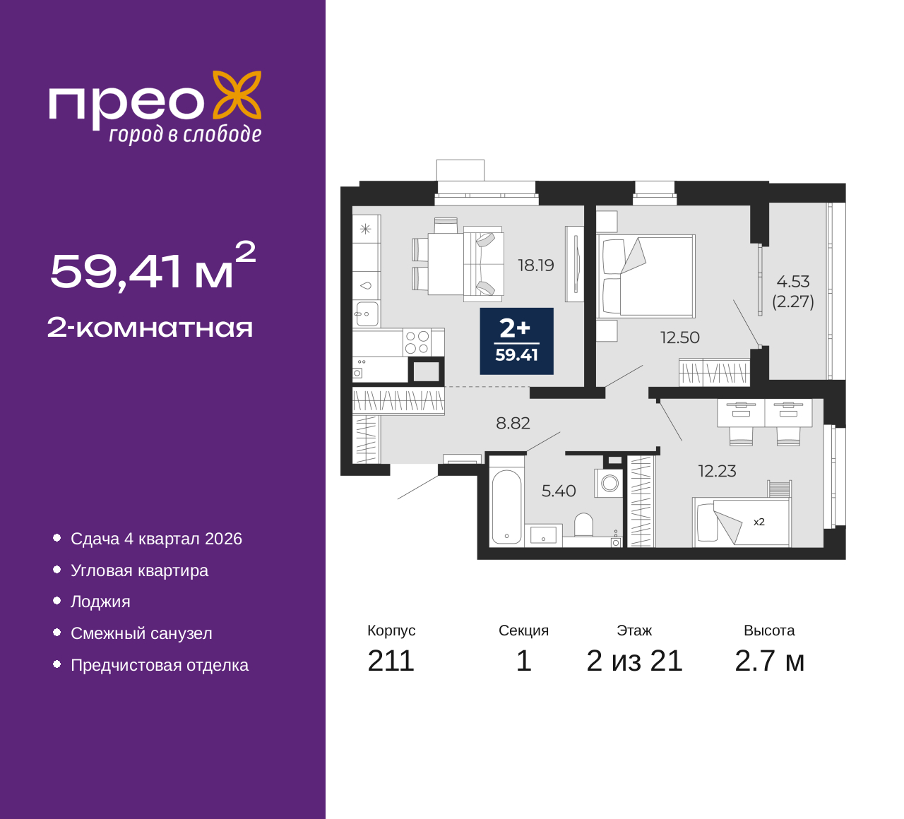 - Общая площадь 59.41 м²