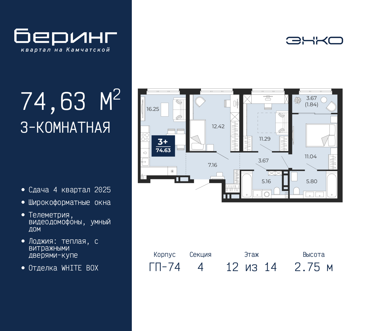 3-комн. квартира в ЖК "Беринг" на 12 этаже. Квартира без отделки, полностью готова к чистовой отделке и дальнейшему ремонту. Общая площадь: 74.63 кв.м., жилая: 34.75 кв.м., площадь просторной кухни-столовой: 16.25 кв.м. Комнаты изолированные, все окна выходят на одну сторону. В квартире одна лоджия, два совмещенных санузла. Высота потолков 2.75 м. Дом монолитный, многоподъездный, переменной этажности, от 9 до 21 этажей. Квартира находится в 4-й секции высотой 14 этажей в корпусе ГП-74. На этаже 7 квартир. В подъезде 1 пассажирский и 1 грузовой лифт. Окончание строительства - 4 квартал 2025 года. Оформление сделки по договору долевого участия. Подобно знаменитому исследователю, мы чувствуем себя первооткрывателями этой локации. Хотим показать новую суть места, сформировать для вас жизненный опыт, которого ещё не было. Беринг — район зелёного цвета. Беринг — район, который откроется вам с другой стороны. Впечатлит новым уровнем комфорта и качеством жизни. Беринг — открытие на карте города. Первый квартал расположен в районе Тура, в границах улиц: Камчатская – Западносибирская – Энтузиастов. Вокруг уже есть всё для того, чтобы ежедневная рутина была лишь частью жизни и не доставляла дискомфорта. Школы и детские сады, магазины и аптеки, поликлиника, места для семейного отдыха, пеших и велопрогулок, и даже рыбалки. Масштабное озеленение дворов — визитная карточка ЭНКО и ваш оазис спокойствия, чтобы отвлечься от повседневности. Раскидистые деревья, кустарники, травы и цветы — осталось остановиться, вдохнуть и расслабиться, глядя на эту природную красоту. Стилистика подъездов продолжает концепцию Беринга, вдохновлённого Камчаткой: сдержанный, но при этом впечатляющий дизайн соседствует с удобством и функциональностью. (AQID02317146)