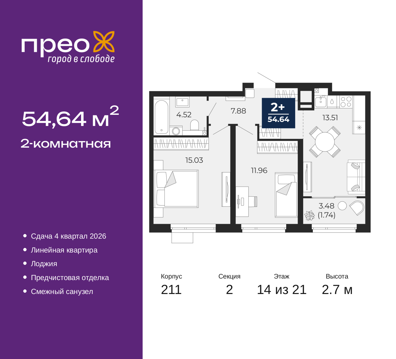 Двухкомнатная квартира от застройщика с предчистовой отделкой в ЖК "Прео" на 14 этаже. Общая площадь: 54.64 кв.м., жилая: 26.99 кв.м., площадь просторной кухни-столовой: 13.51 кв.м. Комнаты изолированные, все окна выходят на одну сторону. В квартире одна лоджия, один совмещенный санузел. Высота потолков 2.7 м. Дом монолитный, черырехподъездный, переменной этажности, от 14 до 21 этажей. Квартира находится во 2-й секции высотой 21 этаж в корпусе 211. На этаже 10 квартир. В подъезде 1 пассажирский и 1 грузовой лифт. Окончание строительства - 4 квартал 2026 года. Оформление сделки по договору долевого участия. Преображенский — один из самых привлекательных районов для жизни! Это полностью самостоятельный жилой район с точки зрения инфраструктуры. Преображенский находится между Московским и Червишевским трактами в квартале улиц Закалужская — Вьюжная — Александра Протозанова. Не нужно ждать, когда появится инфраструктура — переезжайте на всё готовое. Вблизи расположены действующие школа и детский сад. В этом году откроется еще один сад, а в следующем году — школа. По соседству с Преображенским запланировано строительство городского парка «Комарово» площадью 38 гектар. За 10 минут можно доехать на автомобиле до крупных ТРЦ: «Лента», «Кристалл», «Леруа Мерлен», «Метро» и «Ашан». С 2018 года в районе открыт Соседский центр — пространство, созданное для формирования добрососедской среды, совместного досуга, общения и реализации соседских инициатив. Здесь проходят встречи соседей, а также сами жители района организовывают мероприятия. Организатором такого события может стать любой желающий. В квартирах выполнена качественная предчистовая отделка. Гладкие стены с финишным выравниванием по маякам. Ровный потолок для установки натяжного потолка. Установлены пятикамерные окна с двойным стеклопакетом (3 стекла). Дизайнерские холлы с видеонаблюдением, безбарьерным и прозрачным входом – всегда светло и спокойно. На первом этаже есть просторные колясочные, где все жители могут оставлять свои коляски и велосипеды. В Преображенском есть всё, что нужно для активного отдыха и занятий спортом. Мы сделали большое футбольное поле с безопасным покрытием. Также установили хоккейный корт, который оборудован по всем необходимым стандартам. Во дворах можно делать упражнения на специальных площадках с турниками. Весь район мы обустроили велодорожками, которые связаны в единый маршрут. У нас есть сухие фонтаны, бьющие из земли, деревья, веревки, сетки, скалодром, газон, песок и резинка — осталось просто дать своему ребенку право на свободную игру. По-настоящему хорошие дворы — это те, которые дети предпочитают соцсетям и телевизору. Аккредитация в банках: ОАО «Альфа-Банк», ПАО Банк «ВТБ», ПАО «Банк Уралсиб», «Сбербанк России», ПАО «Газпромбанк» и других. (AQID02427599)
