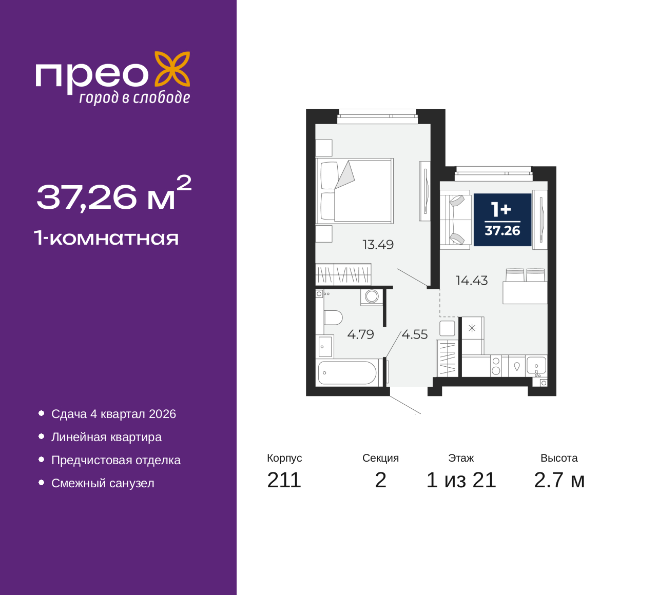 1-комн. квартира с предчистовой отделкой в ЖК "Прео" на 1 этаже. Общая площадь: 37.26 кв.м., жилая: 13.49 кв.м., площадь просторной кухни-столовой: 14.43 кв.м. Все окна выходят на одну сторону. В квартире один совмещенный санузел. Высота потолков 2.7 м. Дом монолитный, черырехподъездный, переменной этажности, от 14 до 21 этажей. Квартира находится во 2-й секции высотой 21 этаж в корпусе 211. На этаже 10 квартир. В подъезде 1 пассажирский и 1 грузовой лифт. Окончание строительства - 4 квартал 2026 года. Оформление сделки по договору долевого участия. Преображенский — один из самых привлекательных районов для жизни! Это полностью самостоятельный жилой район с точки зрения инфраструктуры. Преображенский находится между Московским и Червишевским трактами в квартале улиц Закалужская — Вьюжная — Александра Протозанова. Не нужно ждать, когда появится инфраструктура — переезжайте на всё готовое. Вблизи расположены действующие школа и детский сад. В этом году откроется еще один сад, а в следующем году — школа. По соседству с Преображенским запланировано строительство городского парка «Комарово» площадью 38 гектар. За 10 минут можно доехать на автомобиле до крупных ТРЦ: «Лента», «Кристалл», «Леруа Мерлен», «Метро» и «Ашан». С 2018 года в районе открыт Соседский центр — пространство, созданное для формирования добрососедской среды, совместного досуга, общения и реализации соседских инициатив. Здесь проходят встречи соседей, а также сами жители района организовывают мероприятия. Организатором такого события может стать любой желающий. В квартирах выполнена качественная предчистовая отделка. Гладкие стены с финишным выравниванием по маякам. Ровный потолок для установки натяжного потолка. Установлены пятикамерные окна с двойным стеклопакетом (3 стекла). Дизайнерские холлы с видеонаблюдением, безбарьерным и прозрачным входом – всегда светло и спокойно. На первом этаже есть просторные колясочные, где все жители могут оставлять свои коляски и велосипеды. В Преображенском есть всё, что нужно для активного отдыха и занятий спортом. Мы сделали большое футбольное поле с безопасным покрытием. Также установили хоккейный корт, который оборудован по всем необходимым стандартам. Во дворах можно делать упражнения на специальных площадках с турниками. Весь район мы обустроили велодорожками, которые связаны в единый маршрут. У нас есть сухие фонтаны, бьющие из земли, деревья, веревки, сетки, скалодром, газон, песок и резинка — осталось просто дать своему ребенку право на свободную игру. По-настоящему хорошие дворы — это те, которые дети предпочитают соцсетям и телевизору. Аккредитация в банках: ПАО Банк «ВТБ», ПАО «Газпромбанк», ПАО «Банк Уралсиб», ОАО «Альфа-Банк», «Сбербанк России» и других. (AQID02427480)